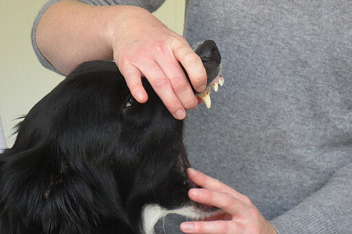 Wenn Sie Zähne und Rachenraum anschauen wollen, drücken Sie links und rechts die Lefzen auf die Zähne. Fast automatisch öffnet dann das Tier sein Maul. Greifen Sie anschließend mit der einen Hand den Oberkiefer und mit der anderen Hand hinter die Eckzähne. Halten Sie so den Unterkiefer fest.