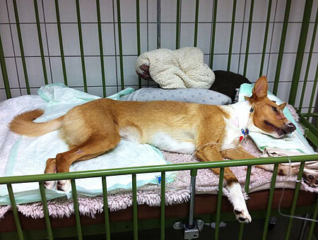 Als erstes fiel eine schlaffe Lähmung der hinteren Extremitäten auf, die sich mittlerweile auch auf die Vorderextremitäten ausgebrei tet hatte. Bei der Hündin wurde eine allgemeine Untersuchung durchgeführt: Sie zeigte leichte Schocksymptome, war von mittelgradig re duziertem Allgemeinbefinden, hatte eine erhöhte Herzfrequenz und gerötete Schleimhäute. Ihr wurde ein Venenzugang gelegt und eine Schockinfusion verabreicht. Nun konnte ich mich auf die Lähmungserscheinungen konzentrieren. Bei der neurologischen Untersuchung fiel mir auf, dass die Hündin zwar willkürliche Motorik hatte, aber nicht geh- und stehfähig war und deutliche neurologische Ausfallserscheinungen aufwies. Die kurze Untersuchung der Kopfnerven ergab eine fehlende Drohreaktion, einen fehlenden Lidreflex und die Nasenscheidewandreaktion war beiderseits nur auf starken Reiz auslösbar. Auch fiel auf, dass die Hündin nicht blinzeln konnte bzw. mit dem dritten Augenlid blinzelte. Die Vorderextremität zeigte noch Reflexe, an der Hinterextremität waren bis auf den Flexorreflex keine Reflexe mehr auszulösen. Die Untersuchung der Wirbelsäule war ohne Befund. Da durch das akute Auftreten und die fortschreitende Lähmung eine Vergiftung oder akute fortschreitende Erkrankung der peripheren Nerven als Differentialdiagnosen an oberster Stelle stand, machte ich mich mit Hündin und Besitzerin unverzüglich auf den Weg in die Medizinische Kleintierklinik der LMU.