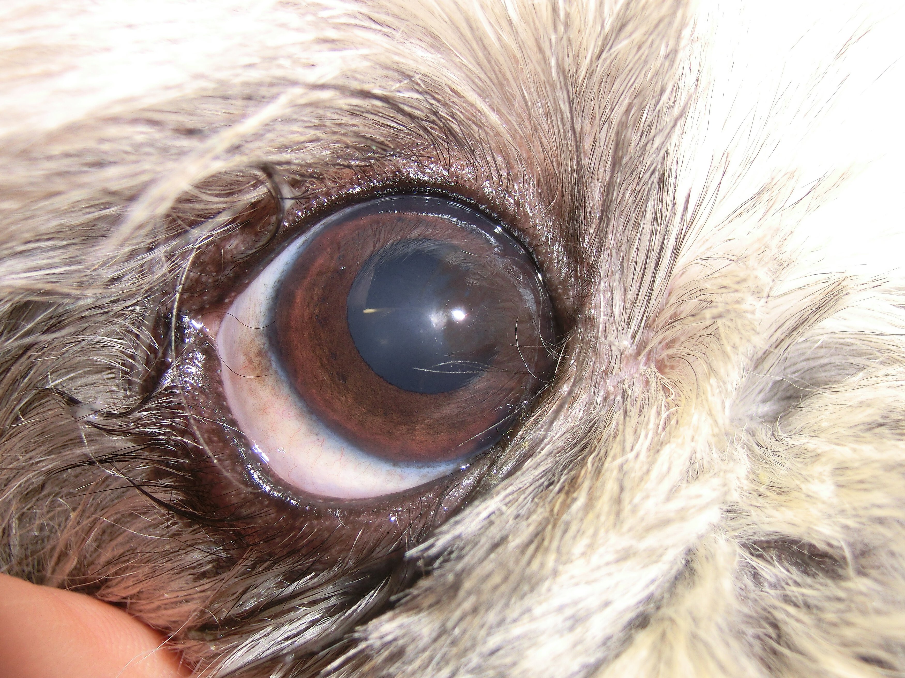 - Epiphora: vermehrter Tränenfluss sowie Verfärbung der Haare im Bereich des Auges bedingt durch den vermehrten Tränenfluss.