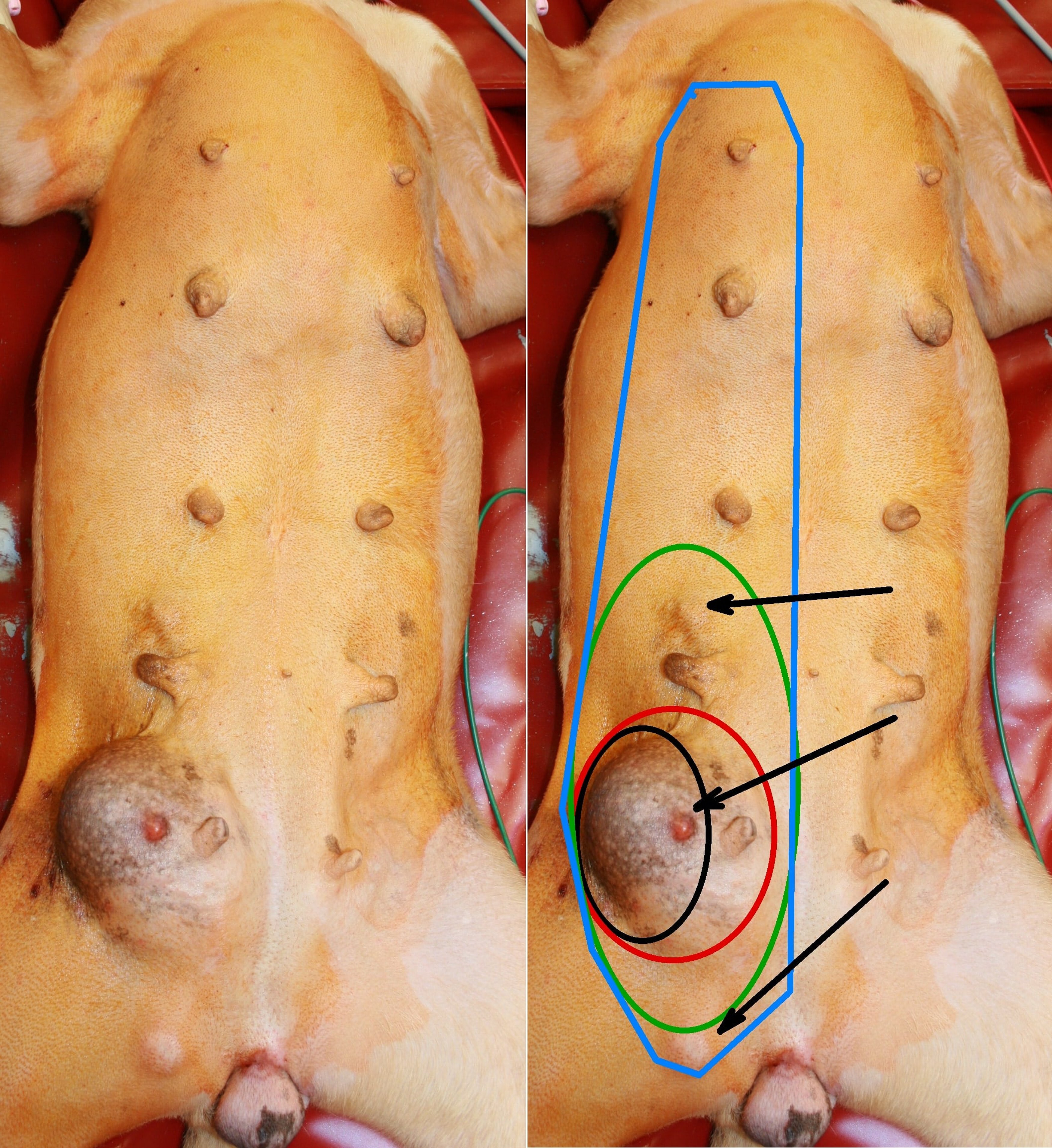 Um eine sichere Diagnose stellen zu können, ist die chirurgische Therapie meist unumgänglich. Je nach Einzelfall zu beurteilen ist, ob die gesamte Mammaleiste entfernt wird oder nur einzelne Komplexe oder Knoten. Allerdings sollte das entfernte Gewebe histologisch untersucht werden, um letztendlich aufgrund des Ergebnisses eine Prognose abgeben zu können. Wichtig ist neben der Chirurgie ebenfalls, im Körper Metastasen (verstreuter Tumor) zu suchen. Hierzu wird meist ein Röntgenbild der Lunge und, wenn nötig, ein Ultraschall des Bauches durchgeführt. Ebenso wichtig sind die Lymphknoten in den umliegenden Geweben; falls diese auffällig sind, sollten auch sie untersucht werden. Nach Vorliegen aller Ergebnisse kann Ihr Tierarzt beurteilen, wie die Prognose Ihres Vierbeiners aussieht. Die Möglichkeiten reichen von „geheilt“ (gutartiger, vollständig entfernter Tumor) bis sehr vorsichtig mit einer kurzen restlichen Lebenserwartung. Über die Sinnhaftigkeit einer Chemotherapie sollte man sich bei einem Spezialisten (Onkologen) beraten lassen.