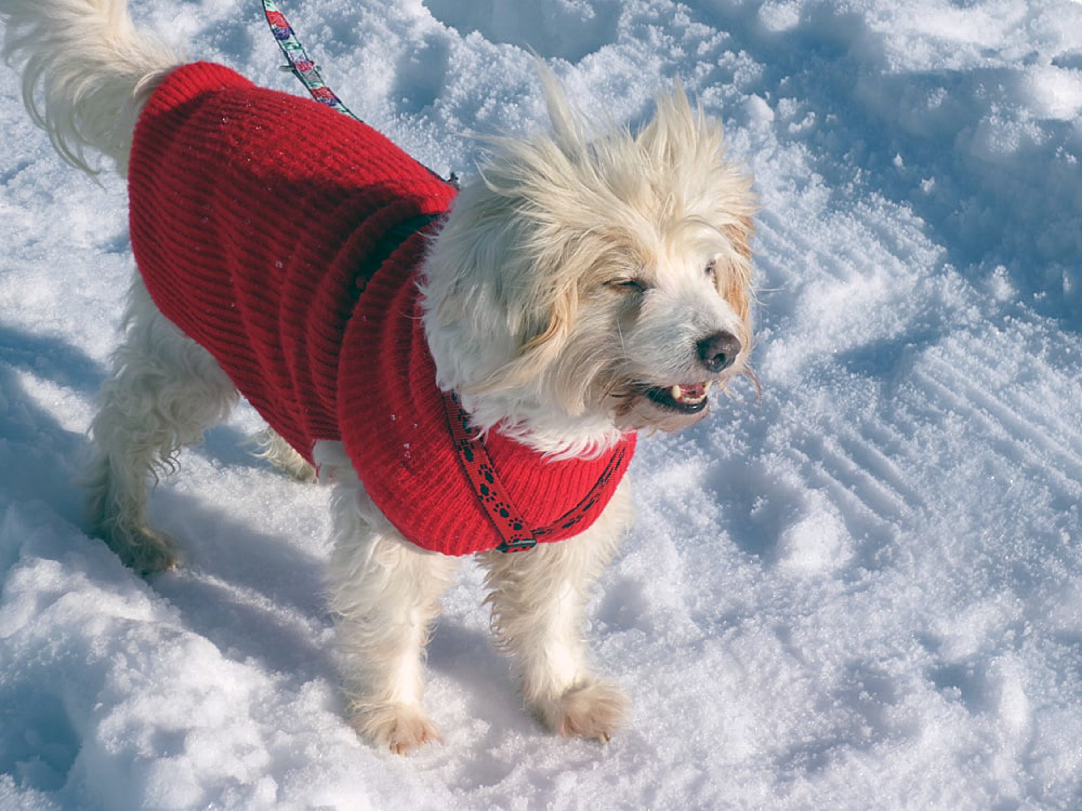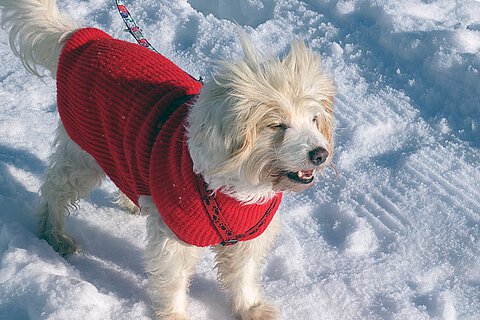 Gegen die Kälte und Nässe Sind nun alle Sicherheitsvorkehrungen getroffen, so geht es an das Anziehen: Ein Mensch zieht sich warme Schuhe, Handschuhe, Mantel und Mütze an, all das hat der Hund nicht und braucht es auch im Allgemeinen nicht! Es gibt jedoch Hundemäntel und Hundepullover, die durchaus ihre Berechtigung haben – ist der Hund z.B. schon alt oder krank, so ist es gut, ihn warm und trocken zu halten. Auch kurzbeinige Hunde freuen sich sicher über einen warmgehaltenen Bauch. Hochbeinige und auch junge und gesunde Hunde, sowie Hunde mit dikkem Fell kommen im Allgemeinen ohne Mäntelchen aus. Es geht jedoch dabei immer um die Funktion, nicht um die Schönheit – bei Kälte ein warmer Pullover, wasserabweisend, und bei Regen ein Mantel aus regenabweisendem Material, der durchaus auch Leuchtstreifen haben kann, sind sehr praktisch. Wenn Ihr Hund einmal bei Ihrem Einkauf vor einem Geschäft warten muss (wovon wir grundsätzlich abraten), so sollte die Zeit nur kurz sein. Sie sollten ihm eine Isoliermatte oder Decke unterlegen. Auch im Auto darf er in der Kälte nur kurze Zeit allein bleiben – im Sommer wird das Auto zu warm – im Winter zu kalt! Wird der Hund von Regen und Schnee nass, so sollte er immer warm abgetrocknet oder trockengeföhnt werden – was viele Hunde sehr mögen. Auch die Pfötchen sollten immer warm abgewaschen werden, besonders, wenn man vielleicht durch Matsch oder Salz gelaufen ist.