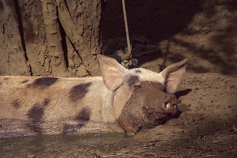 Der Ausdruck „Schwitzen wie ein Schwein“ ist übrigens völlig unzutreffend. Denn Schweine können gar nicht schwitzen. Auch sie fangen an zu hecheln, um sich abzukühlen und vermeiden ohnehin die direkte heiße Sonne, da sie schnell einen Sonnenbrand bekommen würden. Der Stoffwechsel wird heruntergefahren. Ein kühles Schlammbad schafft immer Linderung. Der Schlamm auf der Haut schützt gleichzeitig gegen Bremsen und Zecken.