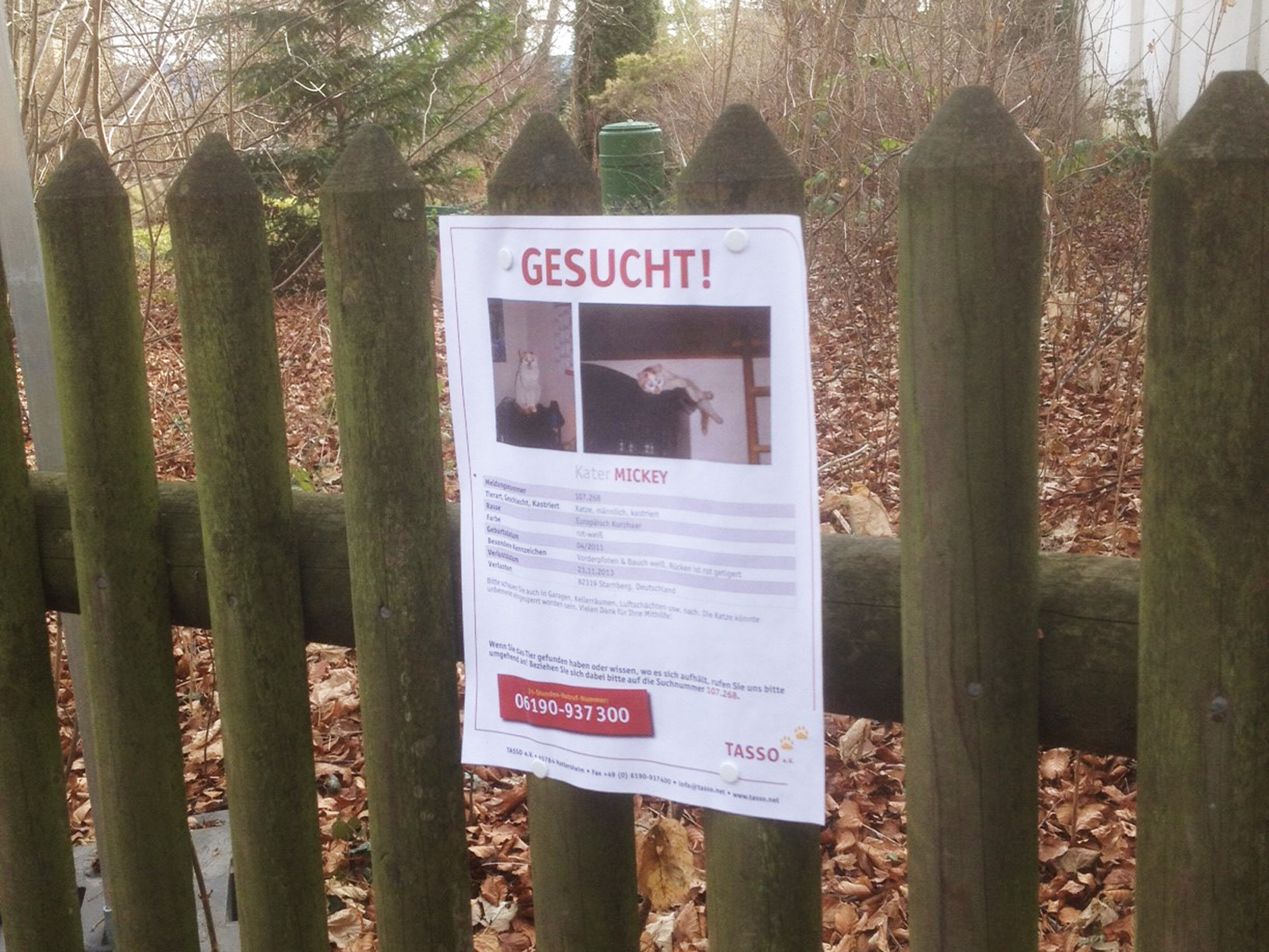 - Wenn Ihr Tier gekennzeichnet ist, sollten Sie Tasso unter der Notrufzentralenummer 06190 937 300 anrufen und Ihr Tier als vermisst melden.