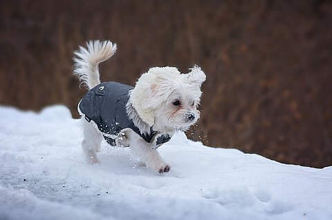 Eine große Rolle für Kälte spielt immer auch Nässe, da Feuchtigkeit dem Körper schneller Wärme entzieht. So sollten nass gewordene Hunde bei kalten Temperaturen immer schnell abgetrocknet werden. Bei längeren Regenspaziergängen kann es daher auch bei kältetoleranten Hunden durchaus sinnvoll sein, diese mit wasserabweisenden Mänteln zu schützen, um ein Durchnässen zu verhindern. Tatsächlich sind Wasserfestigkeit und eine mehr oder weniger dicke Innenfutterschicht des Mantels, je nach Bedarf, damit auch schon zwei wichtige Kriterien für die Auswahl eines Hundemantels. Gerade für Spaziergänge in der Dunkelheit empfehlen sich auch Refektorstreifen oder angebrachte Leuchtmittel, um Hunde im Straßenverkehr leichter erkennbar zu machen. Ein weiterer wichtiger Gesichtspunkt für die Auswahl eines Mantels ist die Akzeptanz. Hierzu sollte ein Modell gewählt werden, das gut sitzt und Bewegungsfreiheit lässt – meist ist hier ein Ausmessen der Körpermaße des Hundes notwendig. Anschließend müssen fast alle Hunde auch an das Anziehen eines Mantels gewöhnt werden. Dies sollte grundsätzlich durch schrittweises Annähern und Überziehen unter regelmäßiger Belobigung erfolgen. Ausdrücklich abzugrenzen sind Hundemäntel abschließend noch von Pullis und Kostümen. Diese haben ausschließlich eine wärmende Funktion, schützen aber unzureichend gegen Regen und Wind. Ein passender Wintermantel kann so Unterkühlungen vorbeugen und zu einer guten Lebensqualität beitragen!