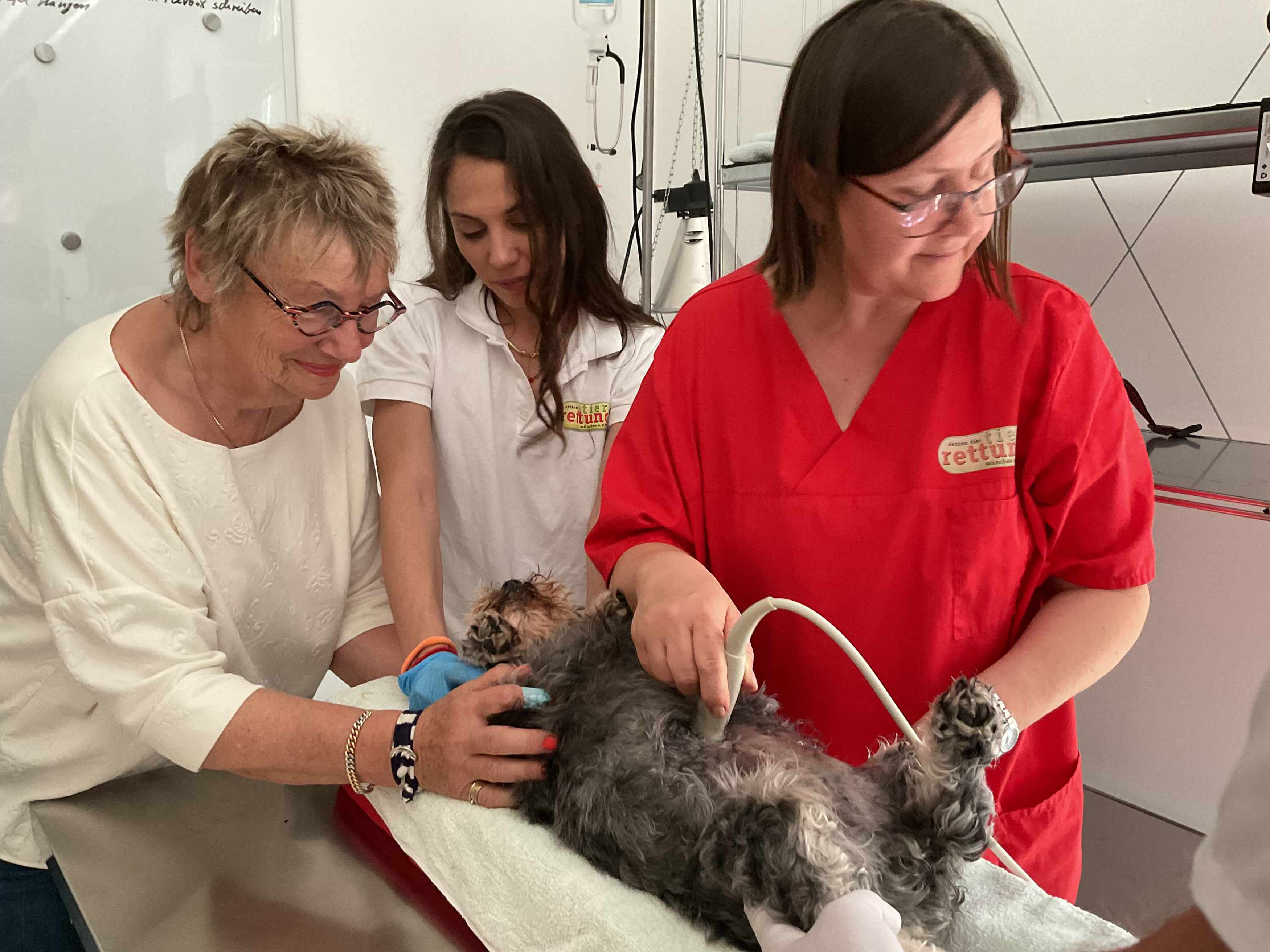 Die Tierrettung München hat ein neues Ultraschallgerät. Da Rosalie eine so entspannte Hündin ist und wir uns einen Überblick über ihren Gesundheitszustand verschaffen wollen, nutzen wir das neue Ultraschallgerät und führen eine Untersuchung durch. Rosalie wird der Bauch rasiert, während sie entspannt auf dem Rücken mit dem Kopf in den Händen von Natasa Pesetis liegt, und das Gel wird aufgetragen. Dr. Wagmeister beginnt mit der Untersuchung, dann kommt Markus Lerner, und Tierärztin Malgorzata Horváth kommt von einem Einsatz und probiert es auch. Wir alle sehen die Milz, den Darm, die Nieren. Alles sieht – für mich sehr beruhigend – unauffällig aus. Nun ist die Behandlung vorbei, Rosalie bekommt ein Leckerli und läuft munter der Assistentin Natasa hinterher. Wie das Ultraschallgerät in Zukunft eingesetzt werden soll, ist noch in der Planung.