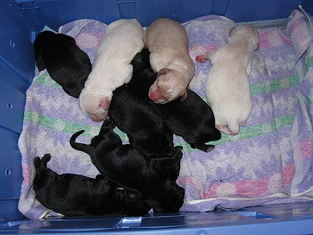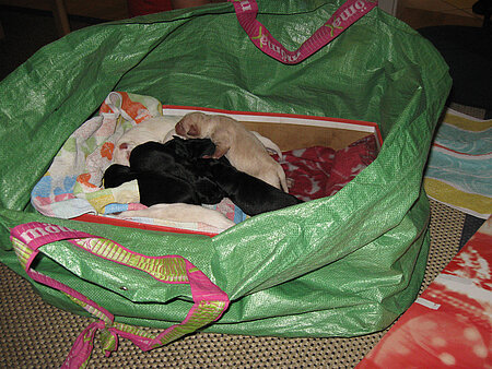 Von Dr. Sylvia Haghayegh und Judith Brettmeister. In der Pappschachtel würde sich ein Knäuel winselnder Hundewelpen befinden. Die Tierärztin Dr. Sylvia Haghayegh fuhr sofort zum Fundort. Die Finderin hatte die Welpen mittlerweile mit ins Haus genommen und auf Bitten der Tierärztin Wärmflaschen vorbereitet, denn der Pappkarton war trotz Plastiktüte schon ganz aufgeweicht. Angekommen, nahm die Tierärztin jedes der Welpen einzeln in Augenschein. Bestürzt stellte sie fest, dass die Kleinen allenfalls ein bis zwei Tage alt waren, denn an jedem von ihnen hing noch die frische Nabelschnur. Es waren acht Welpen, fünf schwarze, zwei weiße und ein semmelfarbener.
