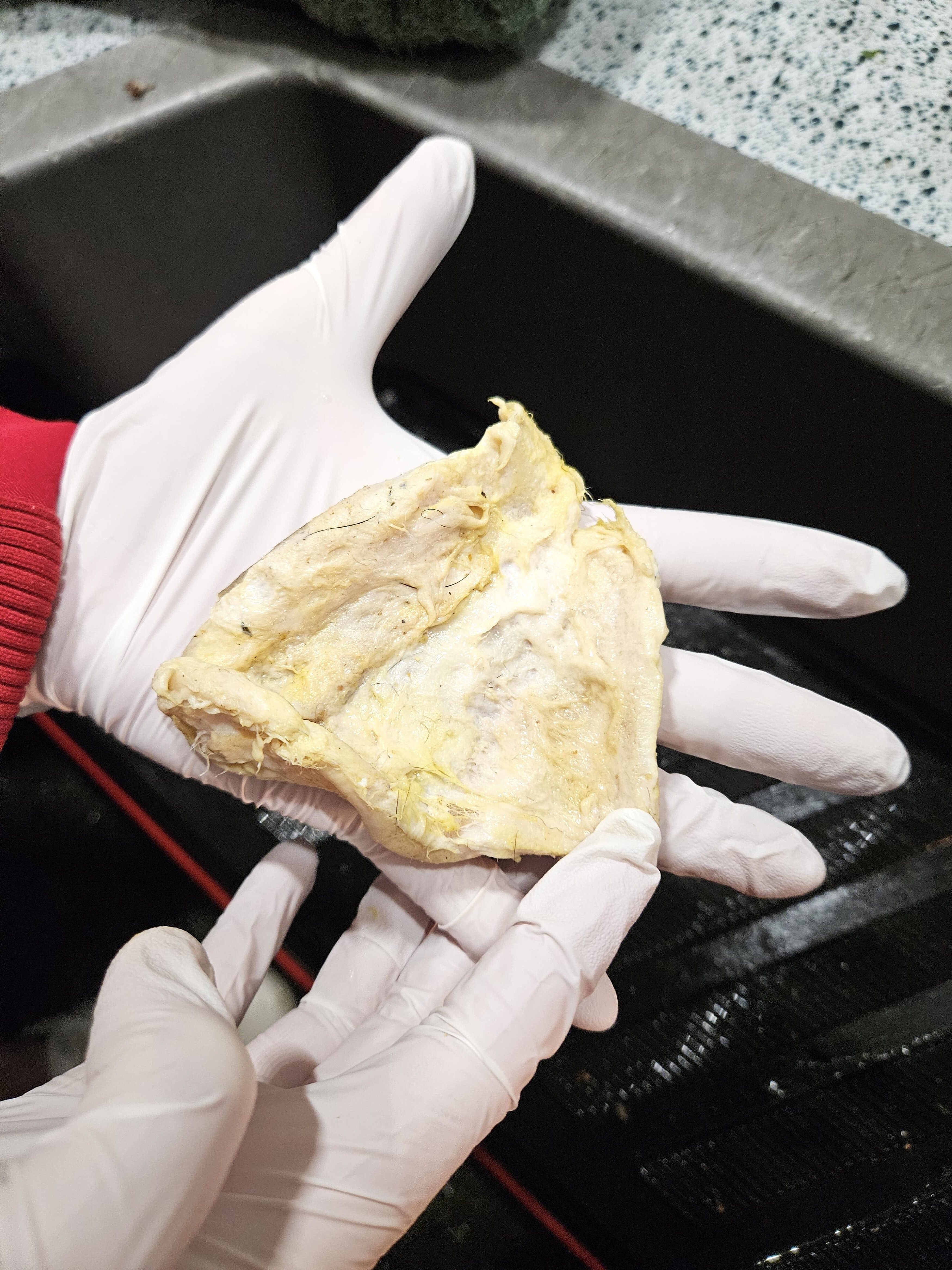Auf dem Transport bekam „Rieki“ von uns Sauerstoff, um die Atmung zu erleichtern. Leider haben wir kein Blaulicht und gerieten aufgrund des starken Unwetters in einen Stau, wegen einer unter Wasser stehenden Unterführung. Hier mussten wir einige Zeit warten, bis die Feuerwehr die Unterführung wieder frei gegeben hat. Genau zu diesem Zeitpunkt hat „Rieki“ sich die Sauerstoffmaske vom Kopf gerissen und erneut erbrochen. Diesmal hat sie es endlich geschafft, dass wirklich riesige Stück Rinderhautknochen hervor zu würgen. Ihre Atmung normalisierte sich sofort und auch ihr Verhalten änderte sich sofort zum Guten. Die Besitzerin war überglücklich, wünschte aber dennoch den Transport in die Tierklinik, um die Bulldogge nochmals anschauen und einige Zeit überwachen zu lassen. Um eine Narkose und Endoskopie kam die Bulldogge aber glücklicherweise rum!