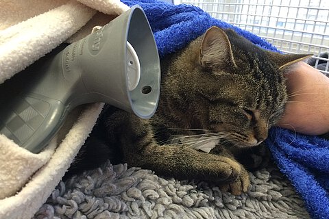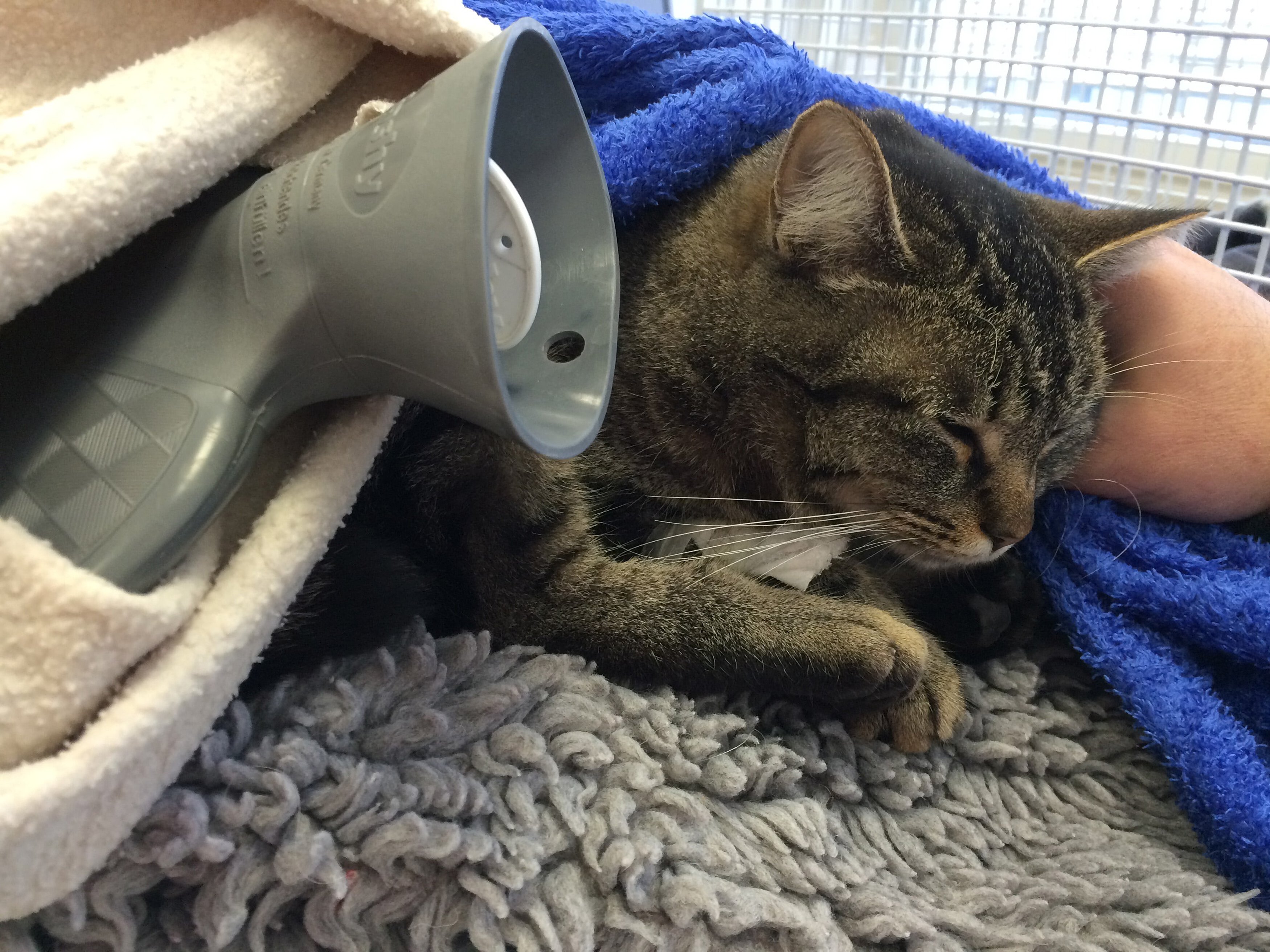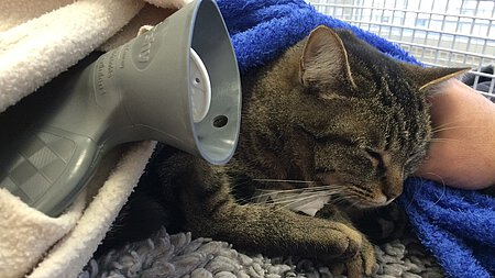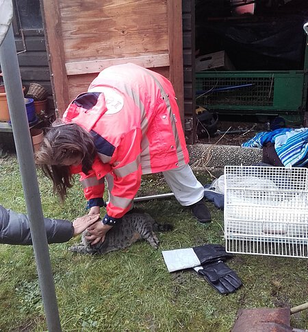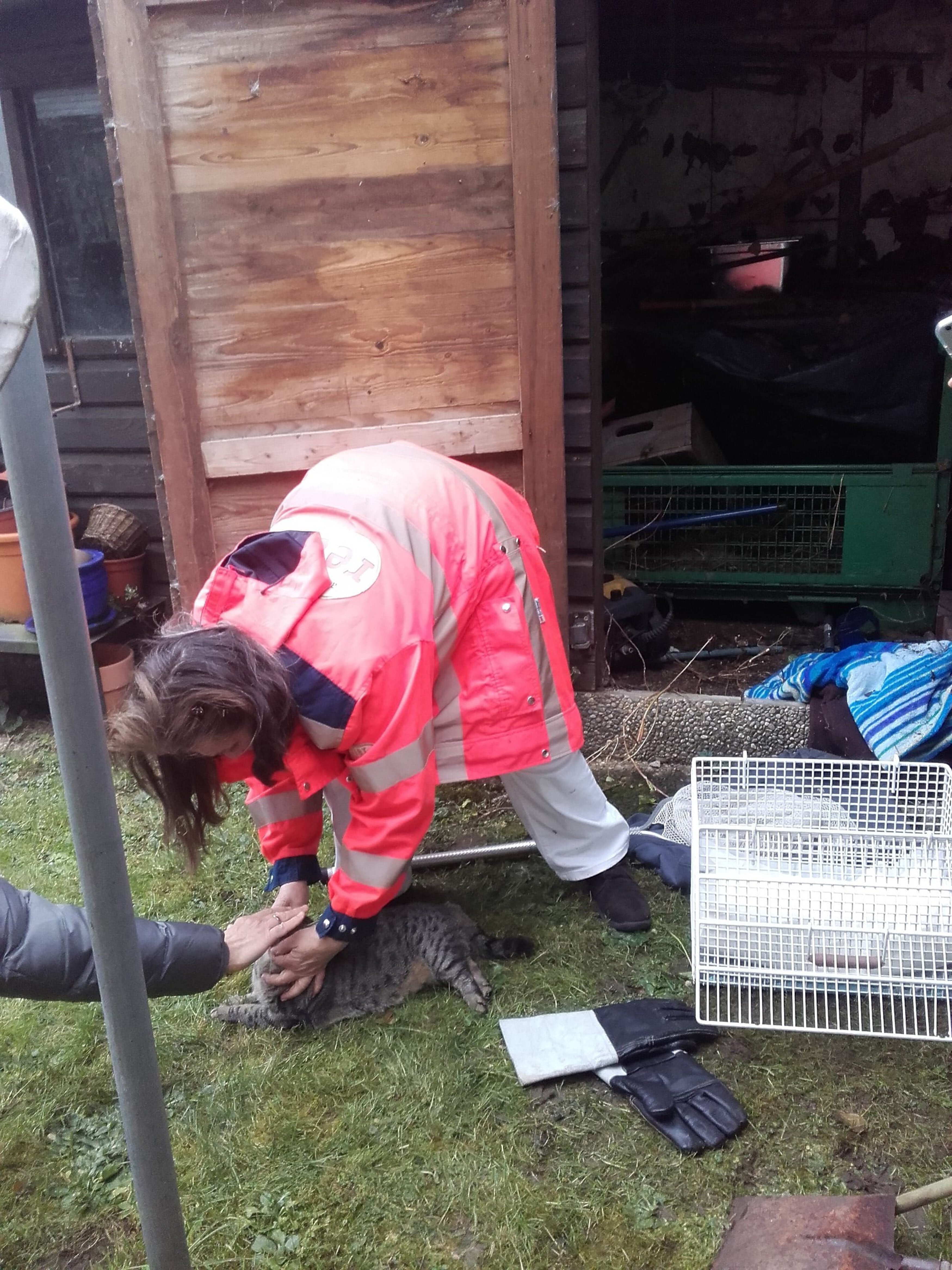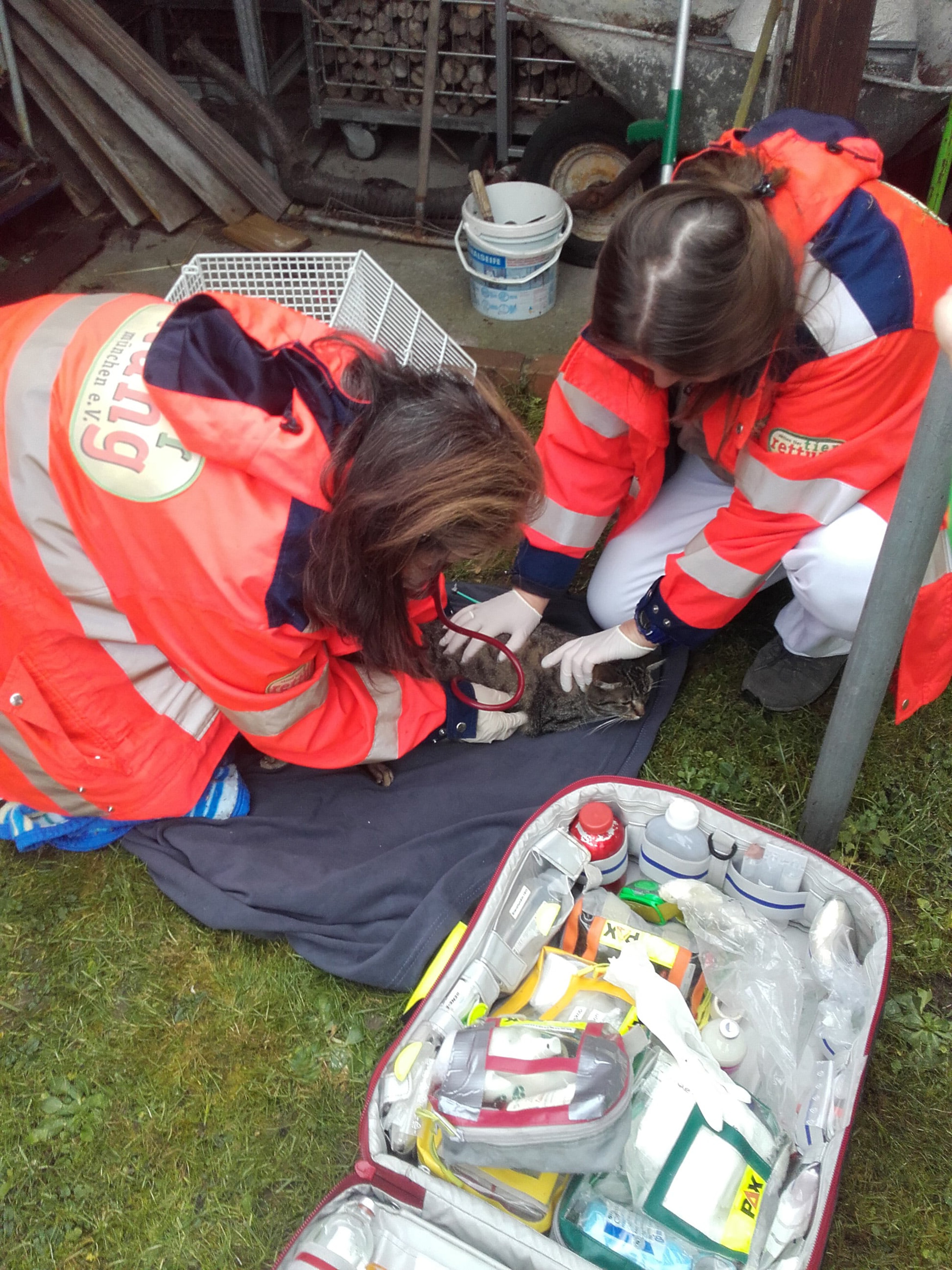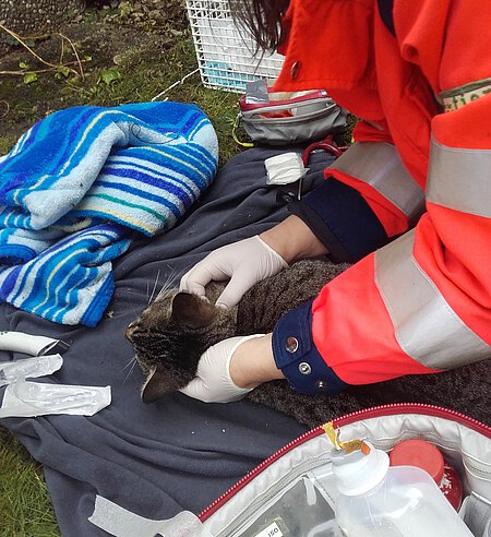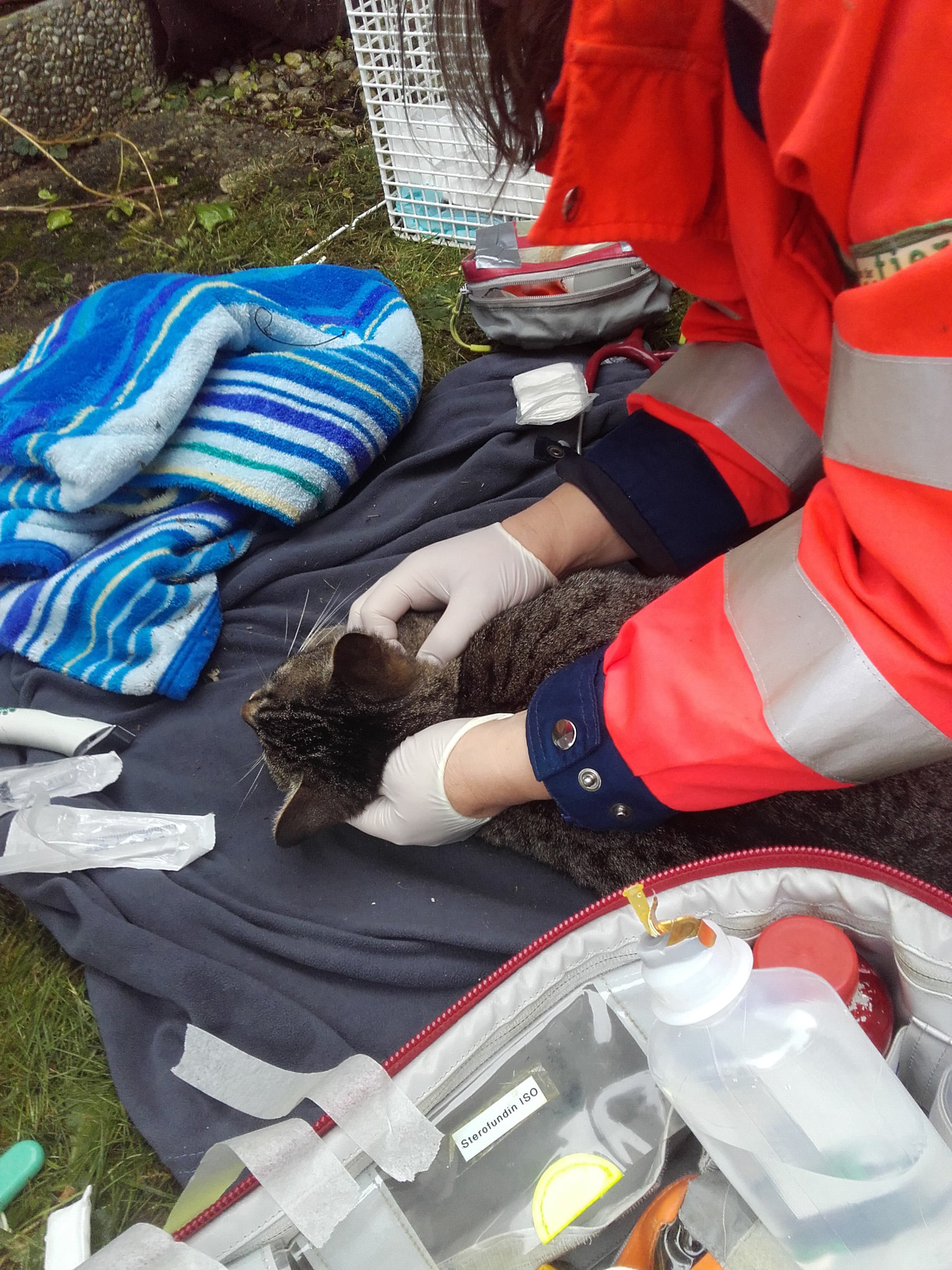 Von einem tierlieben Anwohner erhielten wir den Notruf, dass er für eine angefahrene Katze unsere Hilfe benötige. Die Katze lag schwer verletzt, bei eisigen Temperaturen, auf der Straße. Als er ihr helfen wollte, schleppte sie sich mit letzter Kraft, beide Hintergliedmaßen nachschleifend, in einen Geräteschuppen unter eine Europalette. Mit einem Kescher gelang es uns letztendlich die Katze aus ihrem Versteck zu holen ( vorzuziehen ). Die Katze war in einem lebensbedrohlichen Schockzustand, hatte einen mehrfachen Beckenbruch und war stark unterkühlt. Sie bekam sofort einen venösen Zugang, warme Infusionen und Schmerzmittel. Gemeinsam mit der Besitzerin, die mittlerweile auch vor Ort war, ging es dann mit Wärmeflasche und Wärmepads in die nächste Tierklinik.