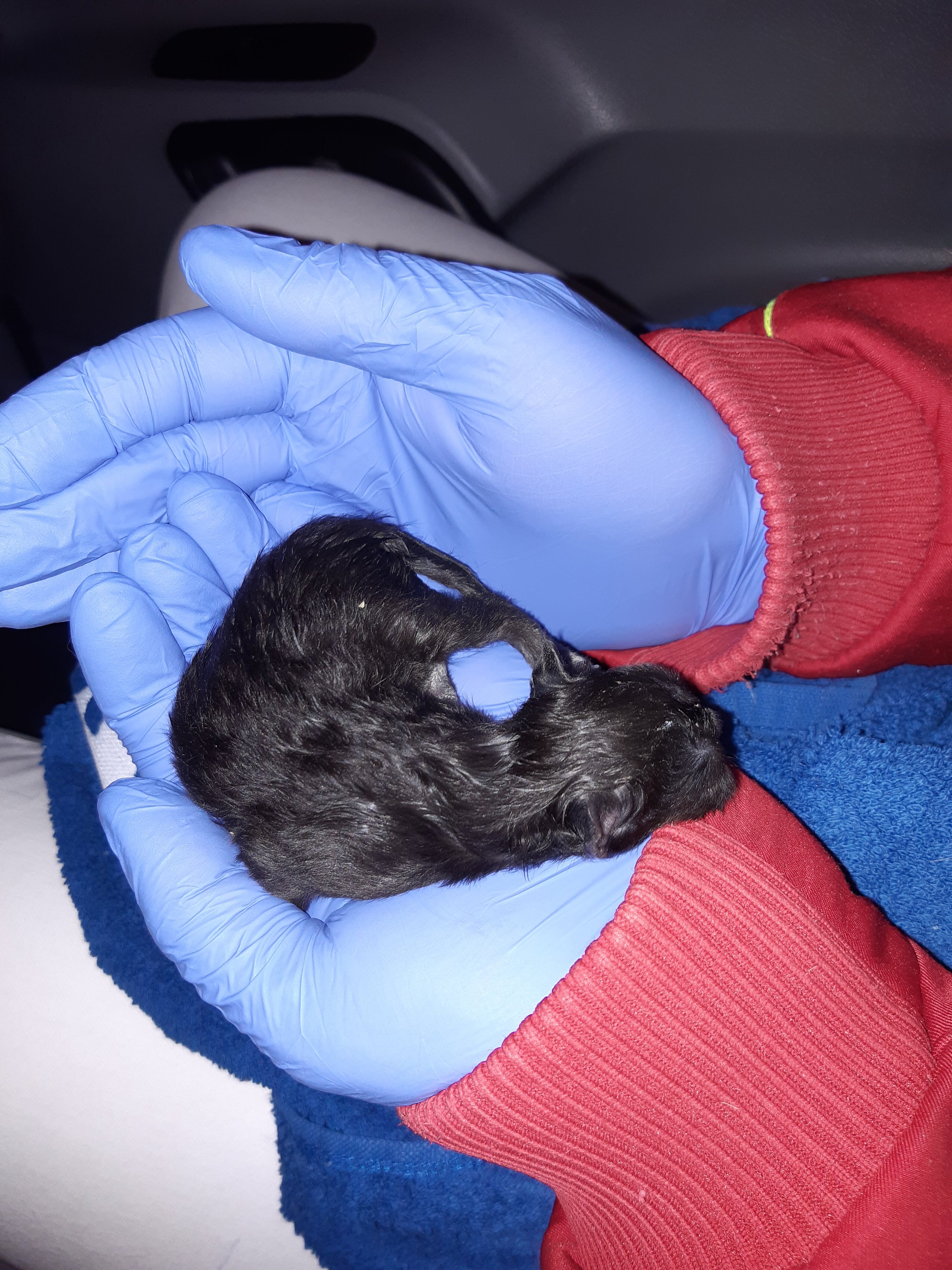 In der Tat hatte der Finder eine Plastiktüte bei sich, in der sich eine Katzentoilette (Streu und Kot) sowie ein Katzensäugling befand. Dieser hatte noch die Nabelschnur und die stark verschmutzte Plazenta an sich. Wir haben die Nabelschnur durchtrennt und desinfiziert, und das Tier wurde vorsichtig aufgewärmt und mit Infusionen und Glucose stabilisiert. Anschließend haben wir das Katzenbaby weiter in die Chirurgische Kleintierklinik München gebracht. Dort wurde es weiter versorgt und schließlich am nächsten Morgen dem Tierheim zur weiteren Aufzucht übergeben.
