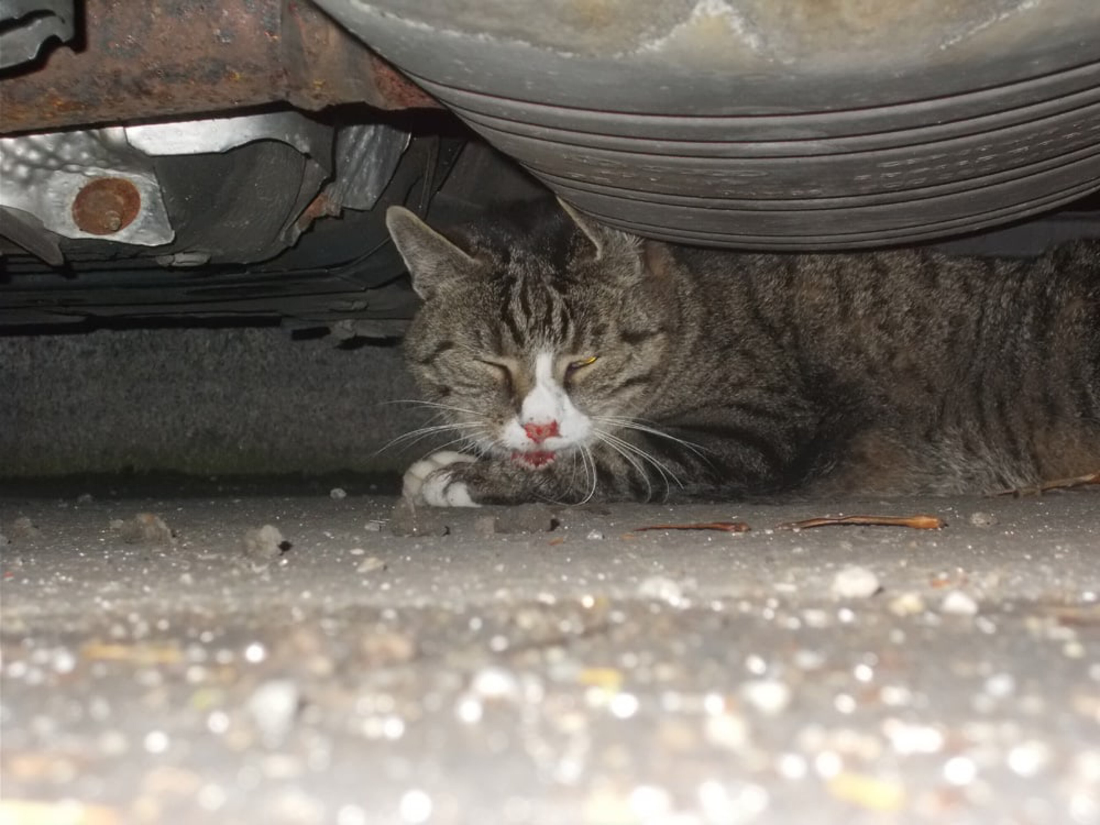 Die Katze schafft es nach diesen beiden Unfällen gerade noch, unter einem parkenden Auto Zuflucht zu suchen. Aufgelöst eilt die Zeugin dorthin und spricht noch einen anderen Passanten an. Sie alarmiert unverzüglich die Tierrettung München und schildert am Telefon, was geschehen ist. Unser diensthabender Tierarzt Dr. med.vet Gabor Horvath muss sich durch den Berufsverkehr quälen und trifft 20 Minuten später ein. Die beiden Passanten sind noch immer dort und helfen später auch bei der Erstversorgung des verletzten Tieres.