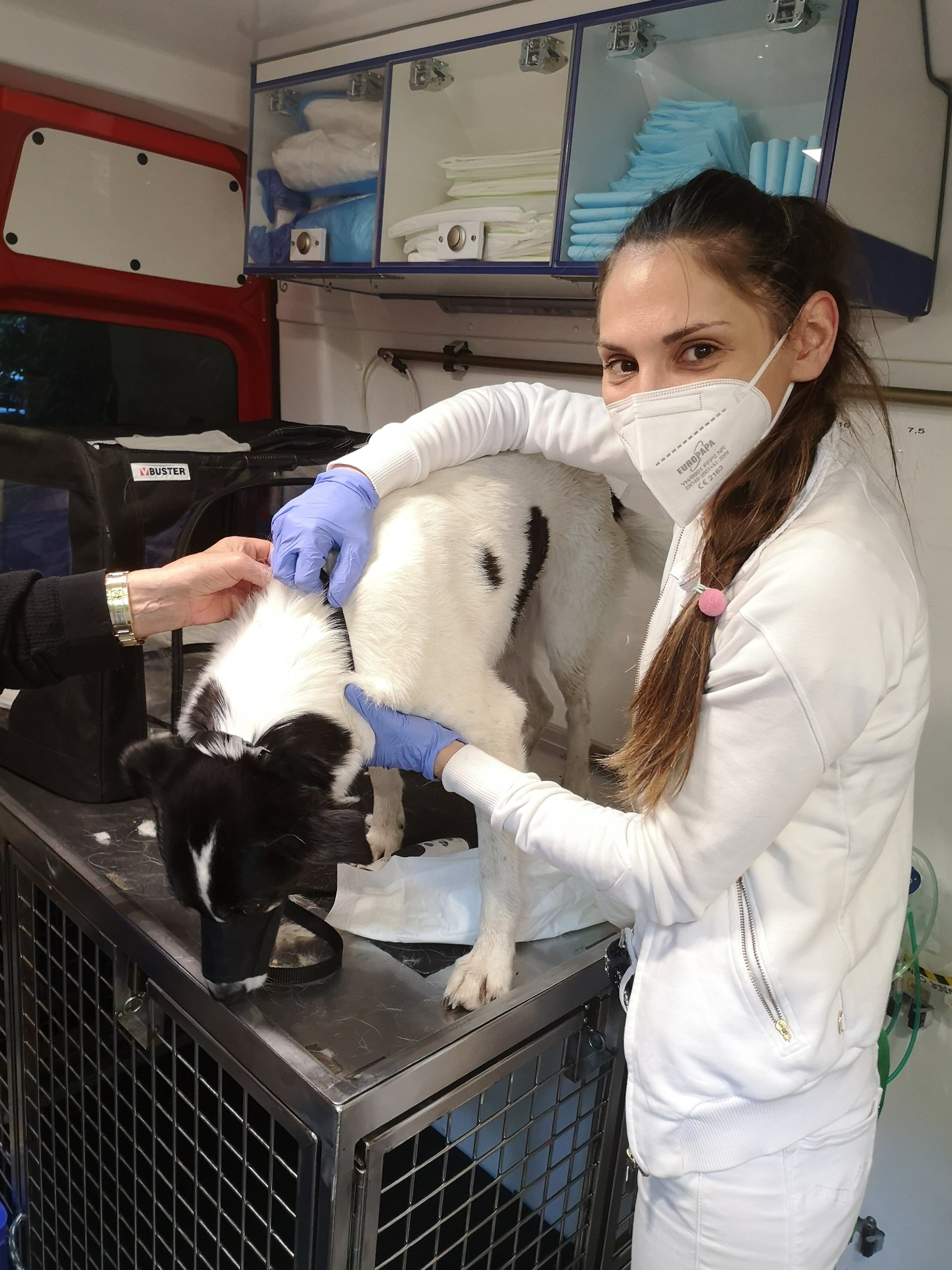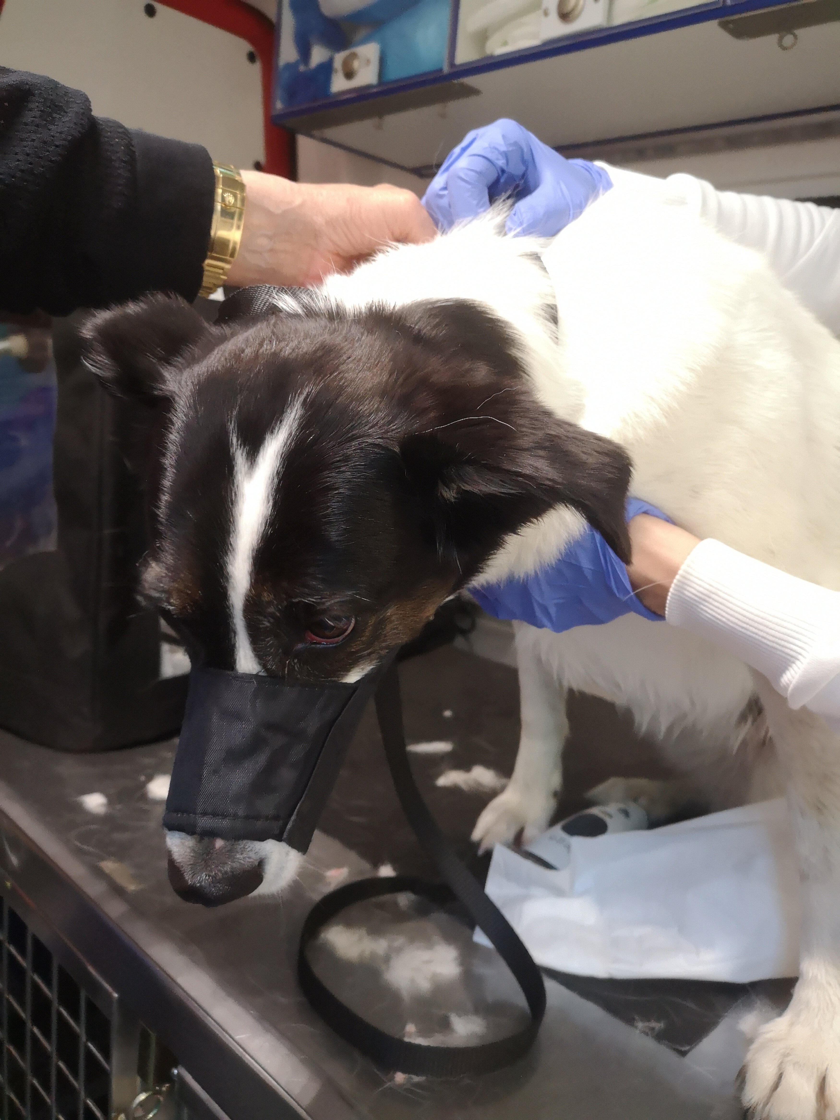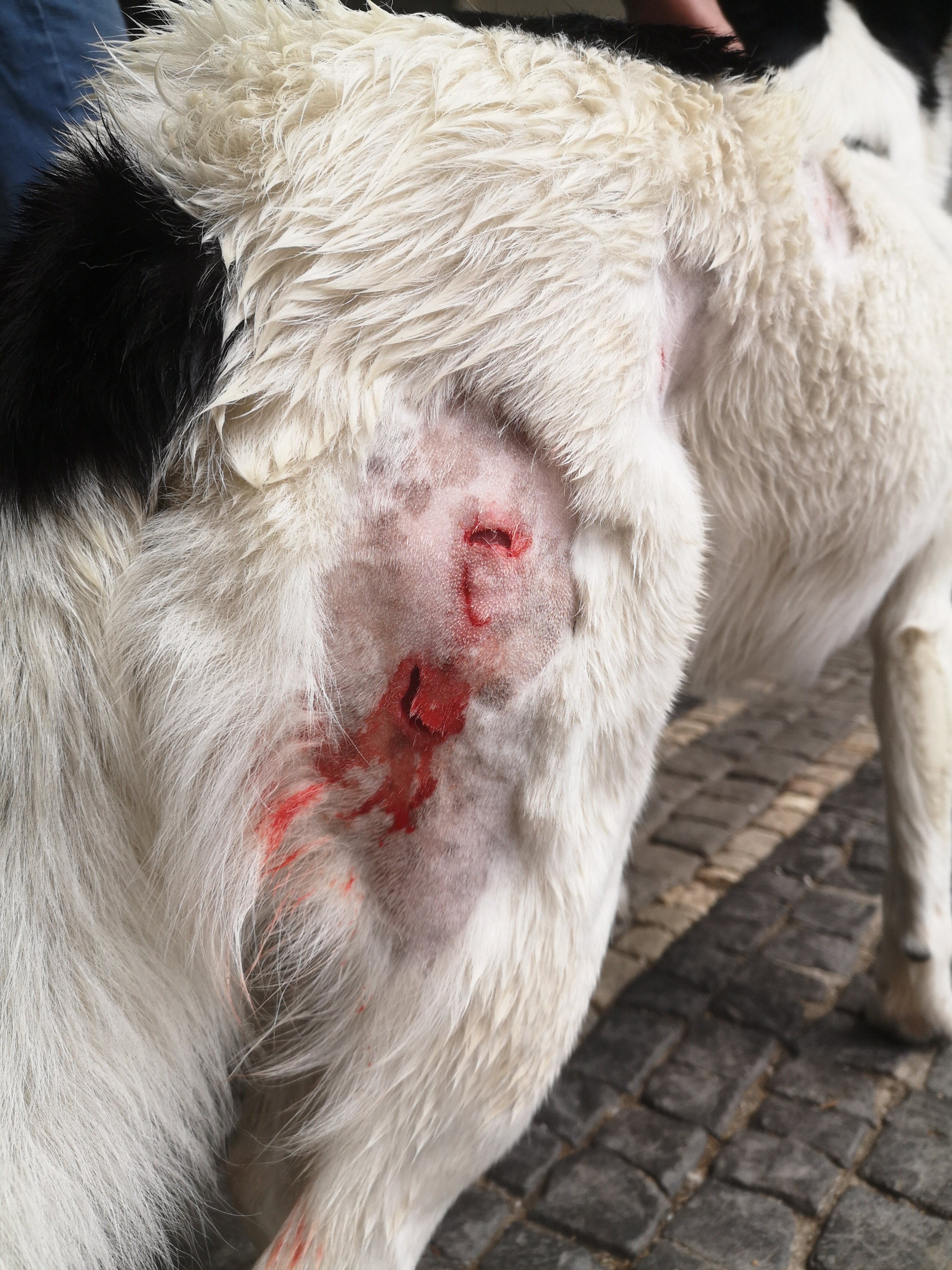 Zunächst bestand die Überlegung, die Wunden vor Ort zu nähen und zu versorgen. Leider stellte sich bei einer genaueren Untersuchung heraus, dass die beiden Wunden, die ca. 10 cm auseinander lagen, verbunden waren. Hier stößt die Tierrettung München mit ihrer mobilen Einheit leider an ihre Grenzen, da hier sehr wahrscheinlich eine Drainage gelegt werden musste. Diese dient dem Wundabfluss, damit sich keine Tasche unter der Haut bildet, in der eine Infektion entstehen könnte. Daher brachten wir die Mischlingshündin in die Chirurgische Kleintierklinik am Englischen Garten, wo sie weiter versorgt wurde.