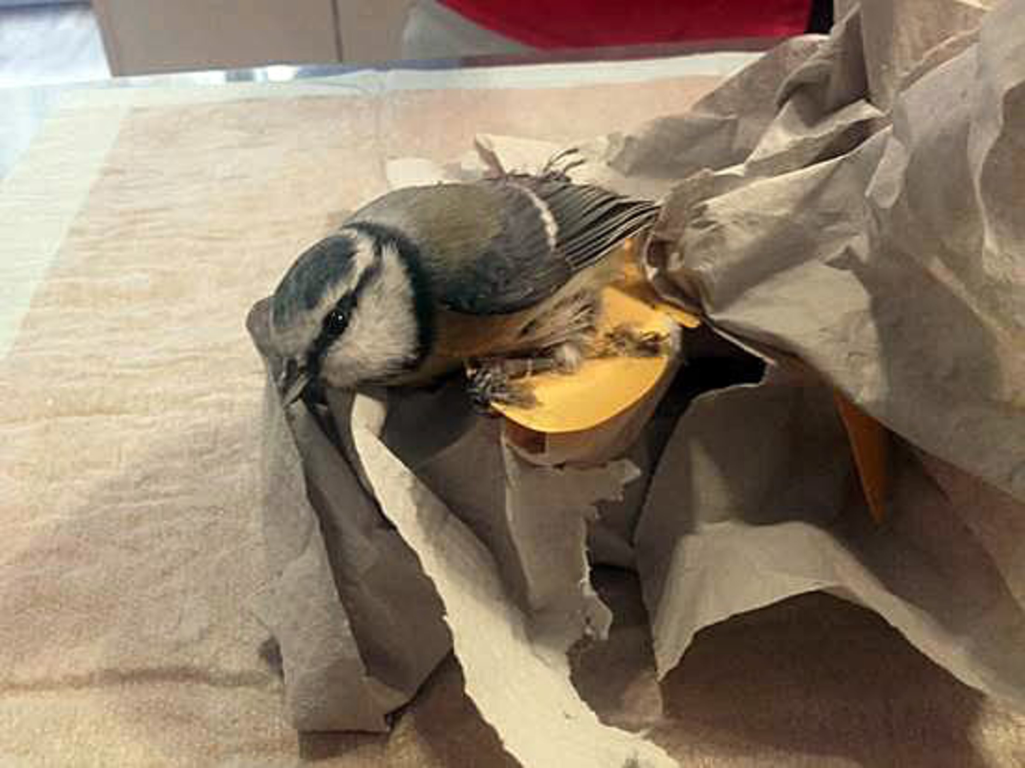 Leider haben wir immer wieder Fälle, wo scheinbar harmlose Gegenstände zu tödlichen Fallen werden. So auch hier: Eine Blaumeise klebte lateral an einer Fliegenfalle, in Form eines gelben „Klebeschmetterlings“, fest.