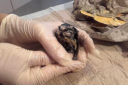 Vor lauter Panik und im Versuche sich zu befreien, fiepte, zappelte und pickte das Tier mit all seinen letzten Kräften. Vorsichtige Versuche, die zarten Federn vom Klebestreifen zu entfernen, waren zwecklos und somit ging es direkt zur Dienststelle, um sich mit Dr. Sylvia Haghayegh zu beratschlagen. Die Lösung lautete Margarine, was unmittelbar getestet und für erfolgreich befunden wurde. Das pflanzliche Fett löste den aggressiven Klebstoff nach und nach vom völlig entkräfteten Vogel. Als er schließlich restlos befreit wurde, mussten wir leider einige offene Stellen an der empfindlichen Haut des Tieres feststellen. Als letzten Schritt entfernten wir so gut als möglich sein Gefieder vom angewendeten Fett mithilfe von saugfähigem Küchenpapier und brachten ihn anschließend in die Vogelklinik Oberschleißheim, wo er leider kurz darauf, vermutlich aufgrund von Erschöpfung, verstarb.