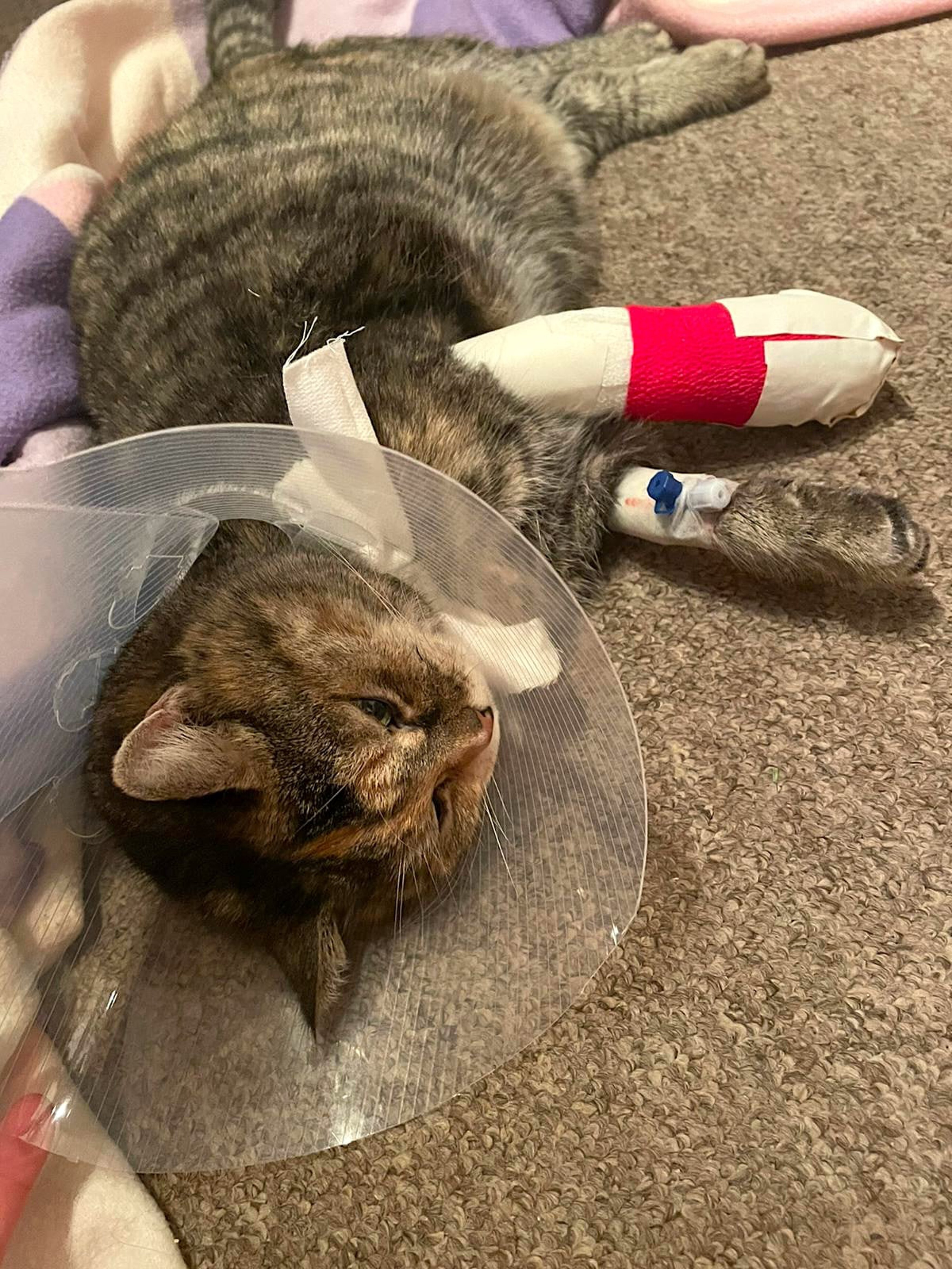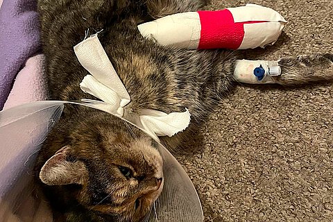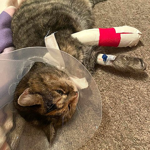 Die Kralle wurde gekürzt und beide Wunden gereinigt und desinfiziert. Eine antibakterielle Honigsalbe wurde auf die Wunden gegeben, bevor wir einen Verband an der Pfote anbrachten. Dieser muss zur Sicherheit in 24-48 Stunden gewechselt werden und die Wunde erneut von einem Tierarzt angeschaut werden. Eine röntgenologische Untersuchung wurde ebenfalls empfohlen. „Muschi“ erhielt aufgrund der Schwellung und des leicht eitrigen Sekrets aus der Wunde sowohl ein entzündungshemmendes Schmerzmittel als auch eine Antibiose. Zum Schutz des Verbandes wurde noch ein Halskragen angezogen, da Katzen Meister im Entfernen von Verbänden sein können.