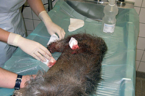 Bevor der vierbeinige Patient in die Tierklinik transportiert werden kann, muss ich den Kreislauf stabilisieren. Ich lege dem schwer verletzten Dackel einen Venenzugang für eine Kochsalzinfusion und Schmerzmittel. Die Bauchdecke wird mit einer in Kochsalz getränkten Kompresse abgedeckt und mit einem Bauchverband umwickelt. Während des Transportes in die Chirurgische Tierklinik der Ludwig- Maximilian-Universität wird dem Dackel noch Wärme in Form eines Heizkissens durch die Besitzer zugeführt. In der Tierklinik angekommen, wird sofort eine Notoperation angesetzt.