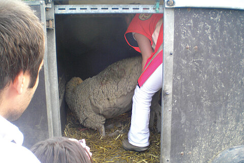 Erstaunlicherweise konnte das Schaf stehen, wenn auch auf drei Beinen. Natürlich war es im Schock, aber das größte Problem war der Tastbefund am Hinterbein: Trümmerbruch Oberschenkel! Mittlerweile war auch der Chef der Schäferei eingetroffen: „Und was fehlt meinem Schaf?“ Nach der Diagnose überlegte er. Eine Heilung ist nur mit einer aufwendigen Operation zu erreichen, mit der Wanderherde mitzuhalten würde in Zukunft schwer möglich sein und nicht zu vergessen, die Kosten einer Operation, die den Wert des Tieres wahrscheinlich um mehr als das Vierfache überschreiten... „Kannst Du’s gleich hier erlösen?“ war die Frage, die ihm dann mühsam über die Lippen kam. Natürlich konnten wir und taten es in der Abgeschiedenheit des Hängers dann auch, eine Notschlachtung wäre für keinen von uns in Frage gekommen, wenn auch rechtlich möglich.