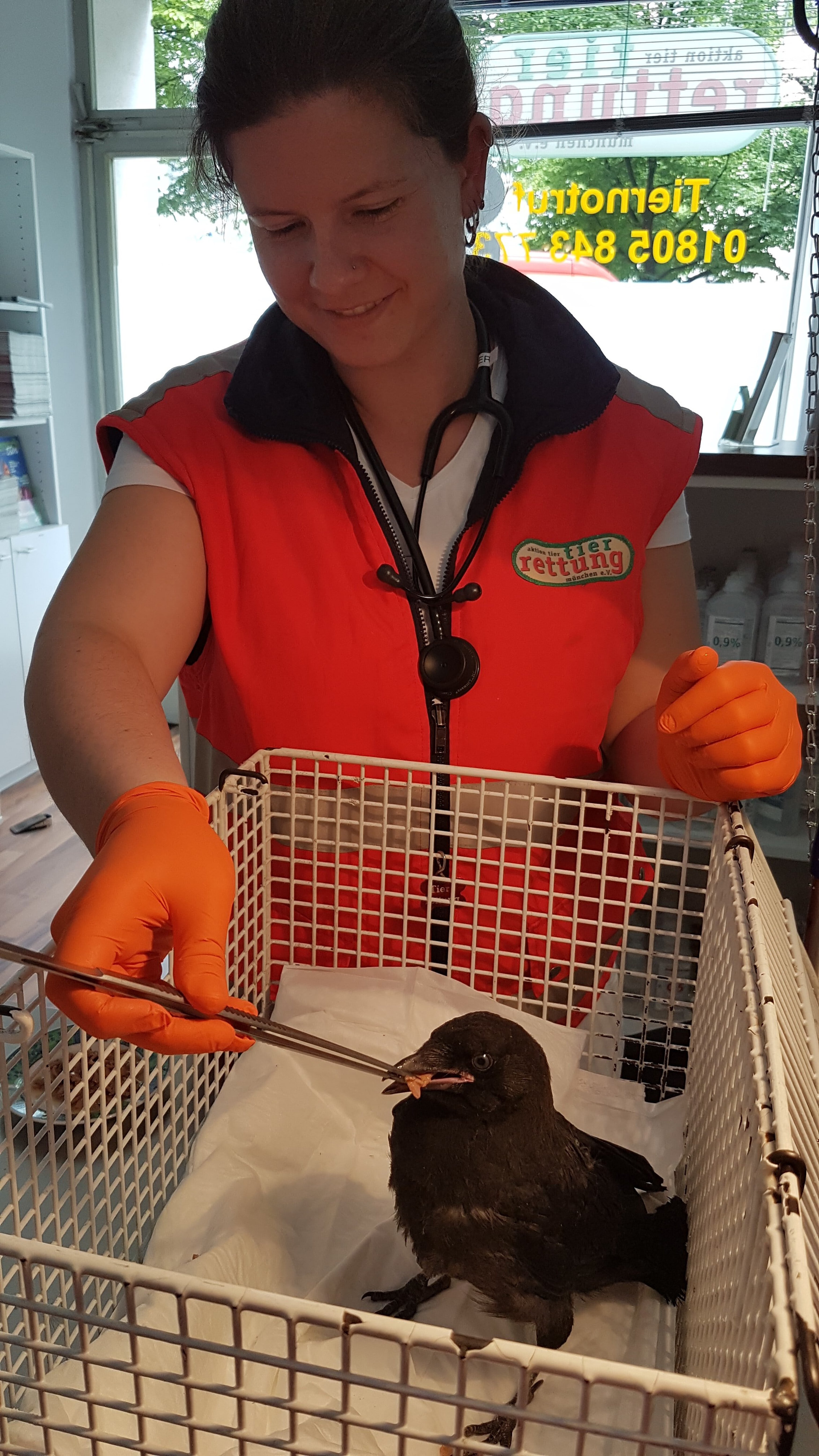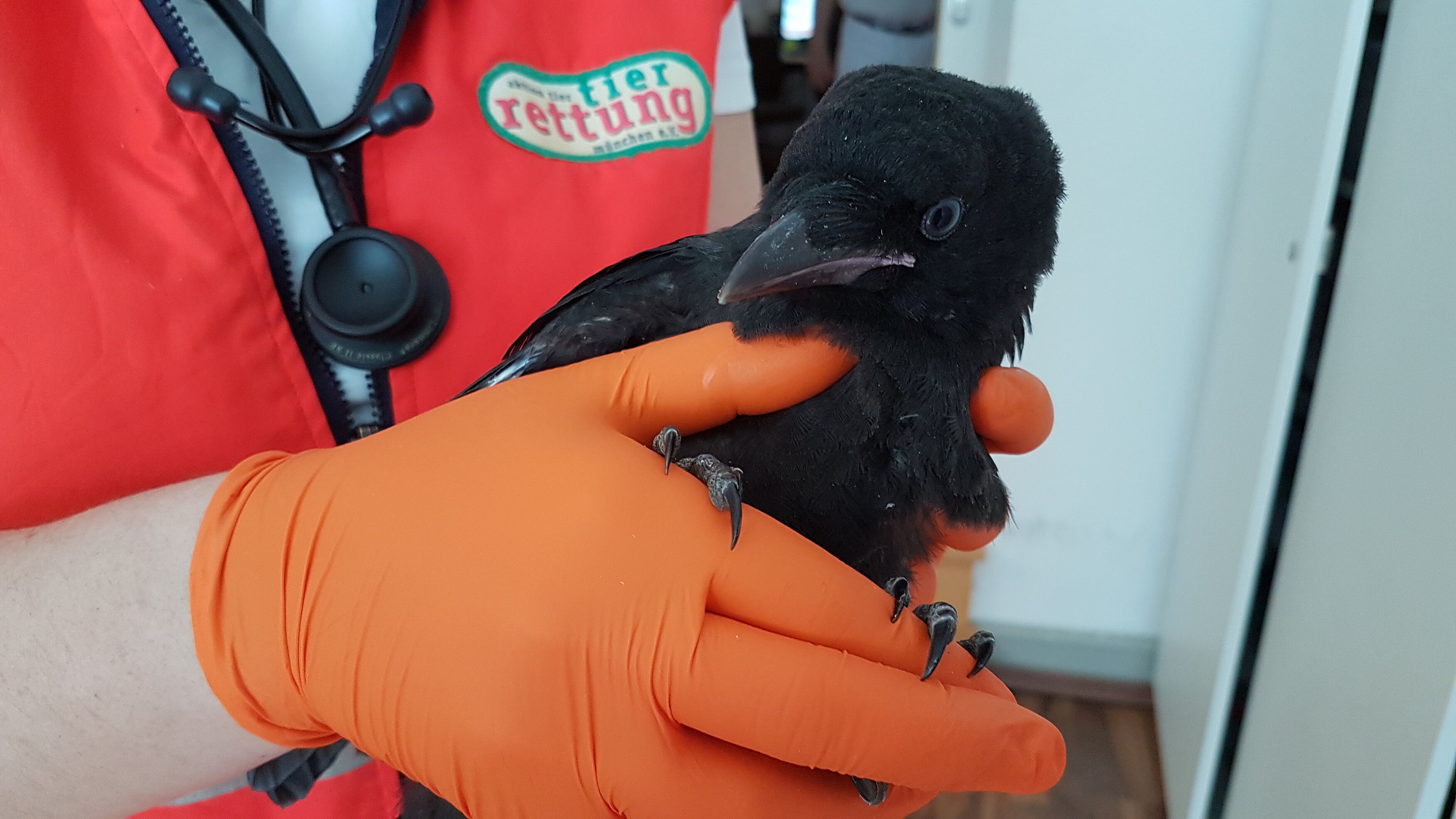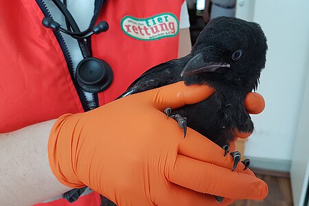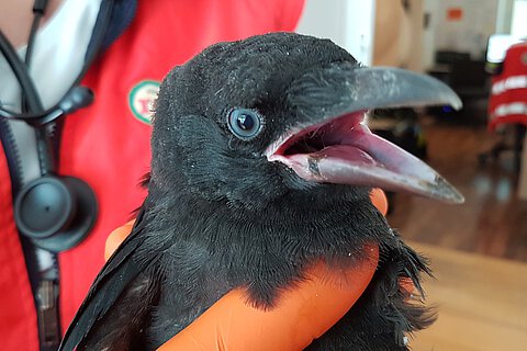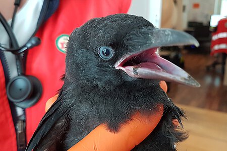 Der Notruf kam von einem Hausmeister einer Münchener Grundschule. Er berichtete, dass erwachsene Raben ein Rabenjunges angegriffen haben. Der Jungvogel war zwar munter und wurde von den Eltern verteidigt, aber der Mann hatte Sorge, dass es nicht mehr lange gut gehen würde.