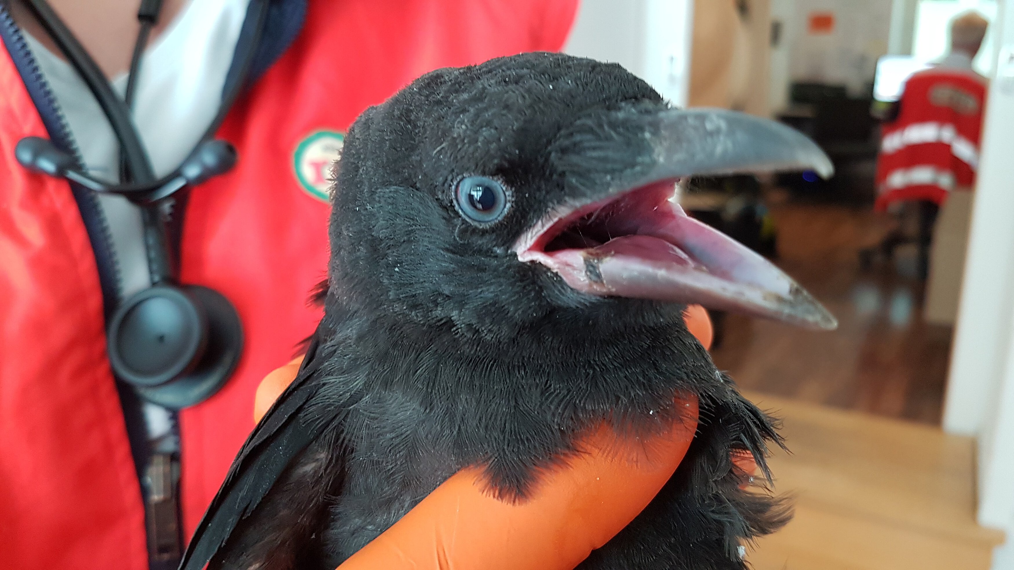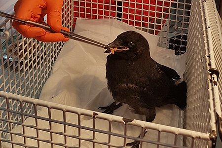 Der Hausmeister hatte keine Probleme, den Kleinen einzufangen. Er entdeckte dabei, dass dieser bereits verletzt war, setzte ihn in einen Karton mit Luftlöchern und rief uns nochmal an. Tatsächlich stellten wir bei der Untersuchung eine Verletzung innen und außen am Unterschnabel, mit einer Schwellung in der Schnabelhöhle, sowie leichte Abschürfungen am Rücken fest. Nach der Erstbehandlung und Fütterung des frechen Patienten brachten wir ihn in die Vogelklinik, wo er sehr bald zum Päppeln ins Tierheim überwiesen wurde.