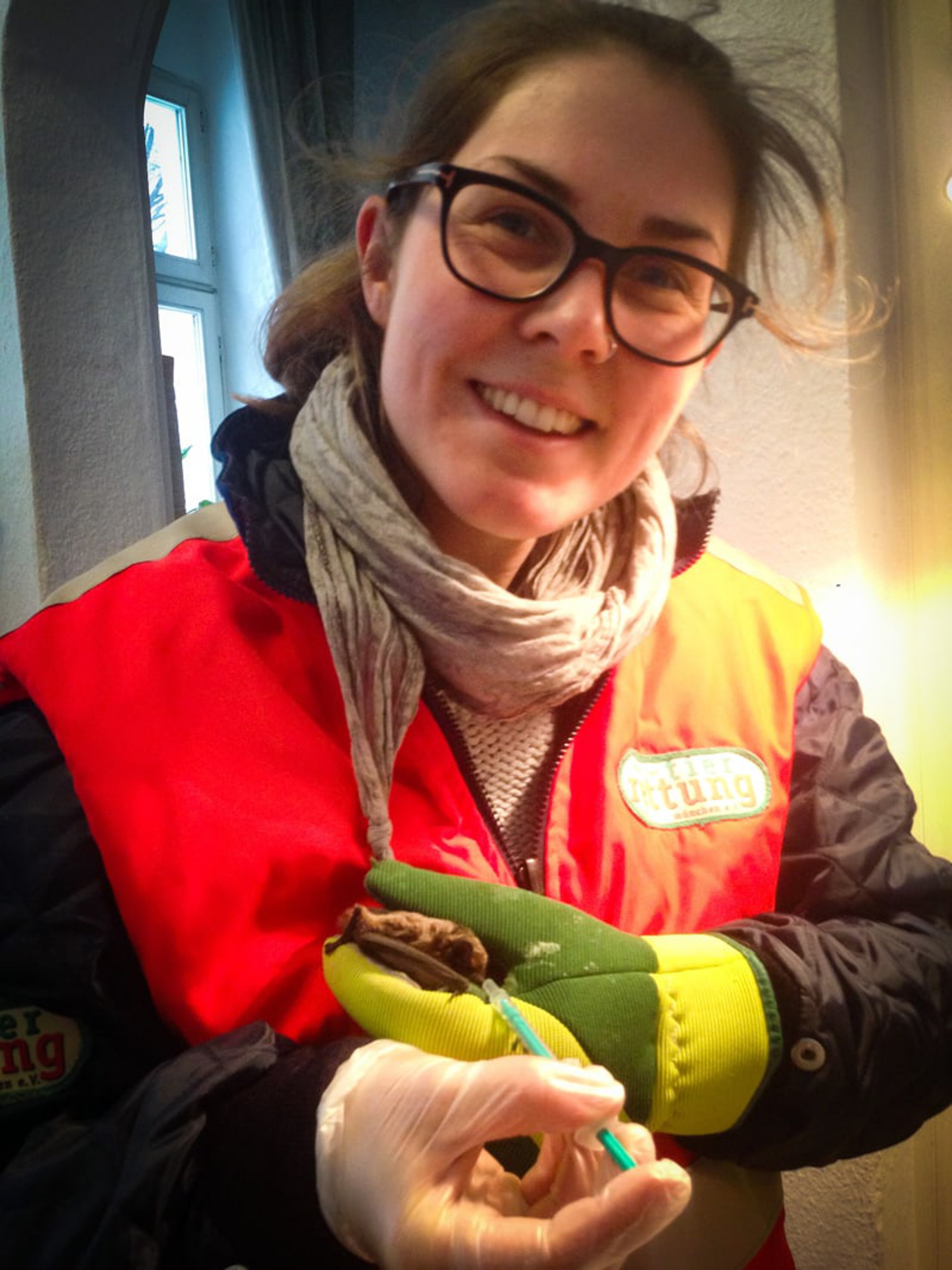 Nach einer kurzen Untersuchung legte ich dem völlig unterkühlten Tier eine Wärmflasche unter sein Handtuch und beleuchtete es von oben mit einer Wärmelampe. Hierbei ist es wichtig, dass das Tier die Möglichkeit hat, sich der Wärme zu entziehen, falls es ihm zu heiß werden sollte. Nach einer Aufwärmphase von ca. einer Stunde zog ich eine kleine Spritze mit flüssiger Glucose auf und bot diese der kleinen Fledermaus an, welche sich als Männchen entpuppte. Nach kürzester Zeit fing dieses an der Spritze zu lecken an und verlangte nach mehr. Nach einer ausgiebigen Verköstigung schien das Tier deutlich agiler geworden zu sein. Ich setzte es zurück in seine Schachtel, welche ich gut verschloss, damit die Fledermaus mit ihrer neu gewonnen Kraft nicht entfliehen konnte. Um ihre fortwährende Versorgung und Beobachtung zu sichern, wählte ich die Nummer von Frau Kistler – die Fledermausspezialistin mit eigener Auffangstation in München Süd. Ich könne sofort vorbeikommen und den Patienten mitbringen. Gesagt, getan, transportierte ich den Kleinen zu seiner neuen Pflegerin, wo er mit einigen anderen Fledermäusen den restlichen Winter verbringen wird, um dann im Frühjahr wieder Münchens Nächte unsicher machen zu können.