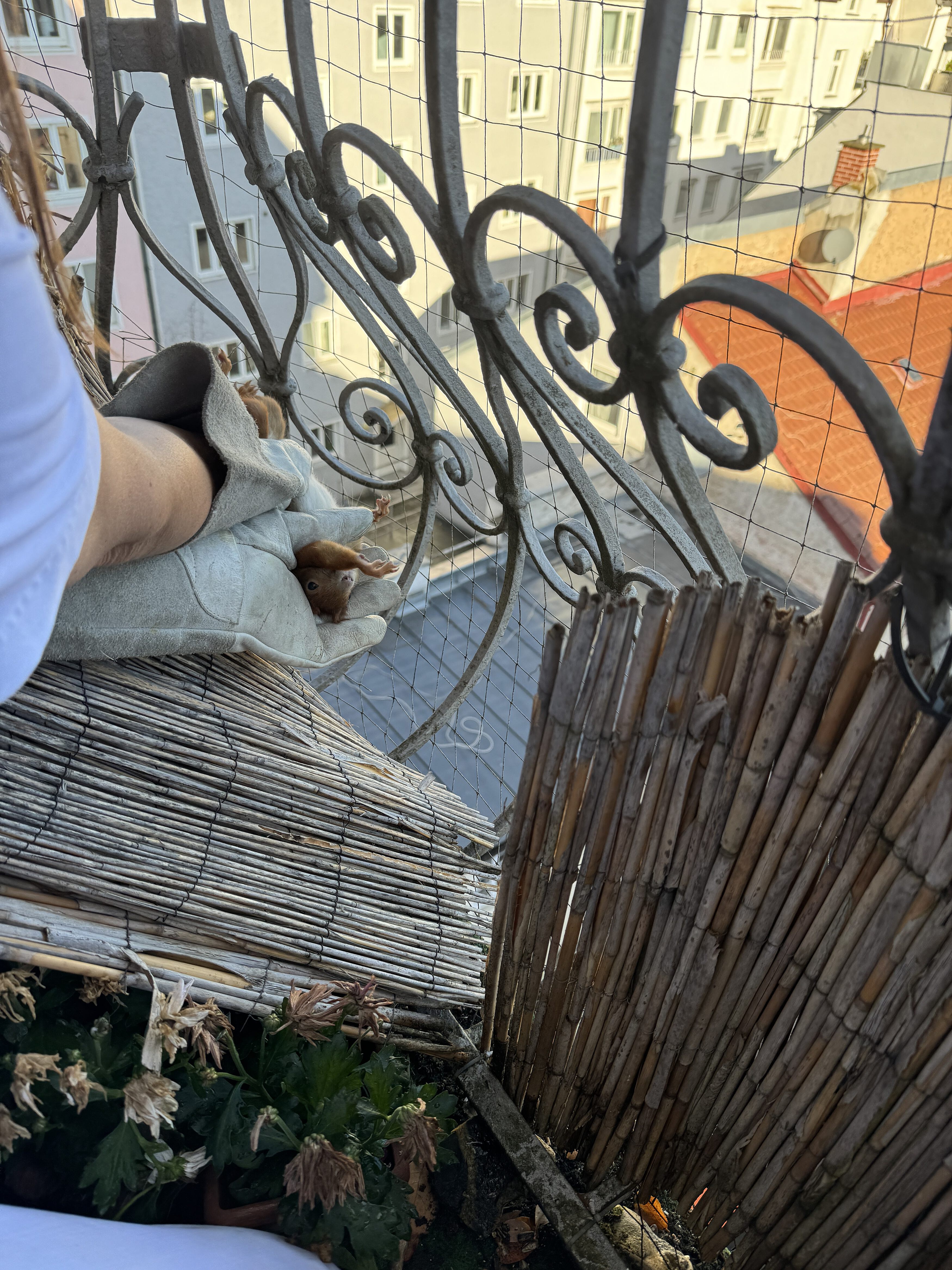 An einem Sommervormittag ging bei uns ein Notruf wegen eines Eichhörnchens ein, das sich in der Nähe unserer Dienststelle auf einem Balkon in einem Netz verfangen hatte. Der Anrufer meinte, dass man an das Tier leicht drankäme, es sich aber zu erwürgen drohte und er es deshalb nicht befreien konnte. Da wir in der Nähe waren, nahmen wir den Einsatz ausnahmsweise an, weil wir wesentlich früher vor Ort sein konnten als die Feuerwehr.