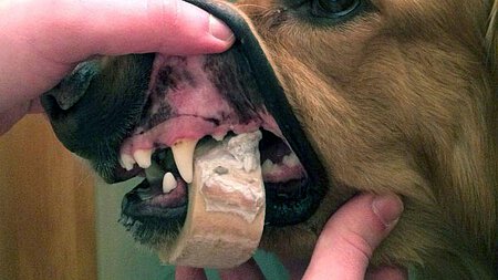 Vor einiger Zeit erhielten Tierarzt Mathias Beyer und seine Assistentin den Anruf einer besorgten Hundebesitzerin, dass sich ihr Hund in einer sehr misslichen Lage befinden würde. Er habe sich einen Markknochen, welchen man in jedem gängigen Tierbedarfsgeschäft oder beim Metzger erhält, so über den Unterkiefer geschoben, dass er aus dieser Lage nicht befreit werden konnte.