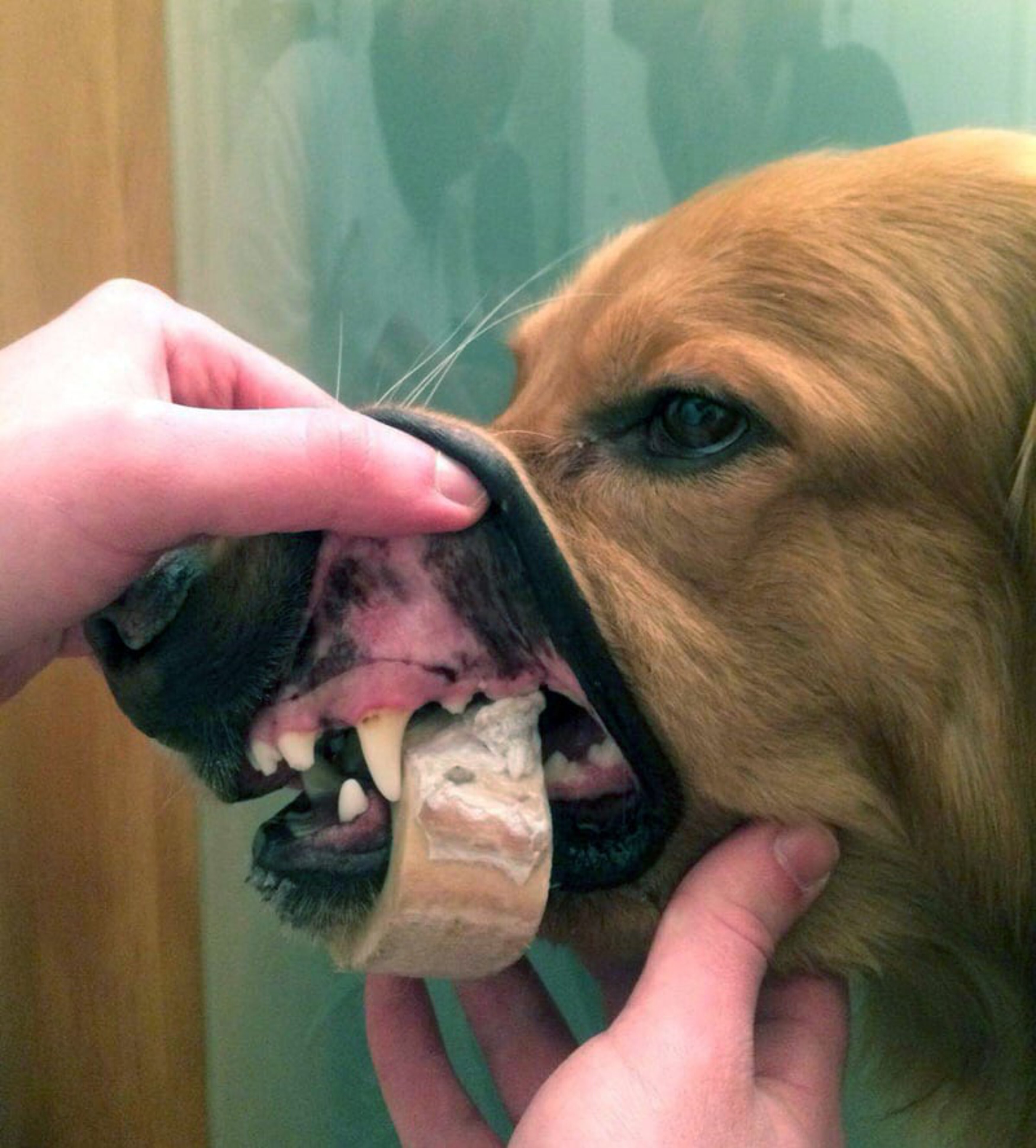 Die Dame bat uns nun mit dem Satz „glauben Sie mir, mit einer Geflügelschere kommen Sie nicht weit!“ um Hilfe. So machte sich das diensthabende Team der Tierrettung auf den Weg, vorher mit einem kurzen Abstecher um adäquates Werkzeug zu organisieren, zum Patienten. Beim Eintreffen begrüßte uns „Diego“, ein imposanter Hovawartrüde im besten Alter, bereits schwanzwedelnd in der Tür. Der zuständige Tierarzt und seine Assistentin inspizierten das Problem genauer und versuchten zunächst, den Markknochen durch Drehen und vorsichtiges Ziehen über die Unterkiefereckzähne zu lösen, was leider nicht gelang.