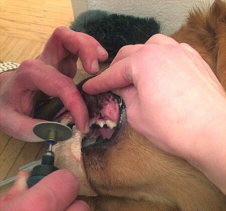Es blieb also nur noch eine Möglichkeit: eine leichte Narkose und der Einsatz einer Trennscheibe. Leider ist „Diego“ Epileptiker, was ein etwas höheres Narkoserisiko beinhaltet. Den Tierrettern blieb aber keine andere Möglichkeit, denn der Gebrauch der Trennscheibe ist doch relativ geräuschintensiv und nicht ganz ungefährlich, sollte sich das Tier bewegen. So wurde der Patient also mit einer s.g. „TIVA“ (Total Intravenöse Anästhesie) über einen Venenzugang in Narkose gelegt. Nach kurzer Zeit war „Diego“ bereits soweit eingeschlafen, dass der Tierarzt mit der Entfernung des Markknochens unter Schnittschutz beginnen konnte. Nach circa 20 Minuten war der Patient sein frisch erworbenes „Anhängsel“ bereits wieder los und die „Operation“ geglückt. Weitere zehn Minuten später stand er wieder, noch leicht benommen, neben uns und war sichtlich glücklich, dass er seinen Fang wieder ohne Probleme und in vollem Umfang schließen konnte. Auch der Besitzerin fiel nach der überstandenen Ultrakurznarkose ein großer Stein von Herzen, und sie versprach, glücklich und zufrieden, nie wieder diese Art von „Kauartikel“ zu kaufen und stattdessen auf tierbedarfsgerechtere Kauartikel umzusteigen.
