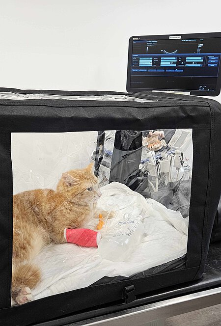 Bis zu unserem Eintreffen war der Kater, der später als Molly identifiziert wurde, etwas stabiler – wach und aufmerksam, aber sichtlich traumatisiert. Gleich fiel auf, dass die hintere Körperhälfte stark beeinträchtigt war. Zwar konnte er die Beine inzwischen wieder leicht bewegen, aber stehen oder laufen war unmöglich. Die Vitalparameter waren insgesamt stabil. Die innere Körpertemperatur war reduziert, aber nicht kritisch. Beide Hinterbeine waren durchblutet, ein Puls war beidseits tastbar. Die hinteren Extremitäten waren zwar kühler als die Vorderläufe, aber nicht kalt oder gar bläulich verfärbt. Schmerzreaktion war vorhanden, was ein gutes Zeichen ist, und auch die Schwanzbewegung war erhalten. Die Untersuchung ergab eine beidseitige unvollständige Lähmung der Hinterbeine – eine Paraparese. Molly hatte also teilweise die Kontrolle über seine Hintergliedmaßen verloren. Aber zum Glück bestand Gefühl in den Beinen, und die Reaktionen zeigten, dass Nervenfunktionen zumindest teilweise erhalten waren.