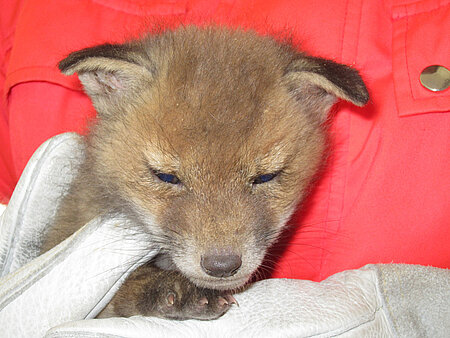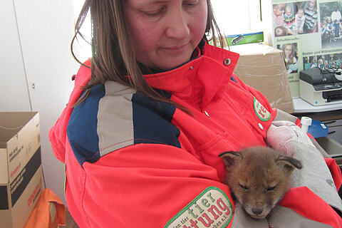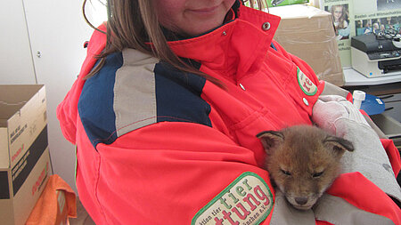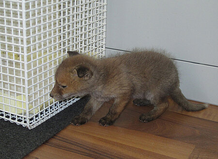 Von Malgozata Horvath. Dieser kleine Fuchs ist vor kurzem in einem Garten gefunden worden. Er ist dort im Zaun stecken geblieben und konnte von den Findern selbständig mit Hilfe von dicken Handschuhen befreit werden. Normalerweise sollten Jungfüchse immer dort gelassen werden, wo sie gefunden worden sind, denn meistens sind sie nicht, wie so häufig von den Findern befürchtet, verwaist, sondern spielen nur außerhalb ihres Baus. Ihrer natürlichen Neugierde folgend, erkunden sie oft ohne ihre Mutter die nähere Umgebung ihres Baus und entfernen sich dann immer weiter, je älter und mutiger sie werden, was ihrem normalen Verhalten entspricht und wichtig für ihre Entwicklung ist. Sollten jedoch Zweifel bestehen, weil ein Fuchswelpe sich längere Zeit an einer Stelle aufhält, so kann man vorsichtig etwas in seine Nähe werfen oder in seine Richtung gehen, um festzustellen, ob er sich ungehindert fortbewegen kann oder vielleicht doch verletzt oder entkräftet ist und an dieser Stelle bleibt. Dies empfehlen wir Anrufern, um zu verhindern, dass gesunde Jungtiere von ihrer Mutter entfernt werden. Man sollte das Tier natürlich nicht ungeschützt anfassen, um nicht gebissen zu werden. Die Finder dieses kleinen Jungfuchses erkannten sehr richtig, dass das Tierchen nun nicht mehr einfach zurück zu seiner Mutter laufen kann und riefen deshalb die Tierrettung an. Ihrer Beschreibung nach war es schwach oder krank und brauchte dringend Hilfe. Da sie außerhalb von München wohnten, und wir wegen der vielen Einsätze innerhalb der Stadt und der Kosten nicht so weit rausfahren können, verabredeten wir uns auf einer Tankstelle an der Wasserburger Landstraße, wo wir schon wiederholt Wildtiere abgeholt haben. Die netten Fuchsretter scheuten weder Mühe noch Kosten, um ihrem pelzigen Findling zu helfen. Sie fuhren nicht nur die weite Strecke, um meinem Kollegen und mir das Tier zu bringen, sondern beteiligten sich auch noch mit einer Spende an seiner Behandlung. Der Fuchswelpe hatte sich bestimmt längere Zeit ohne Futter und Wasser in dem Zaunloch steckend gequält, was wahrscheinlich der Grund für seinen schlechten Zustand war. Die Finder hatten doch schon für Wärme gesorgt und hatten ihm Futter angeboten, aber er war appetitlos, völlig entkräftet und stark ausgetrocknet und brauchte deshalb dringend eine medizinische Versorgung. Die gründliche Untersuchung ergab anschließend keinen Hinweis auf weitere Erkrankungen oder eine Verletzung. Er bekam von uns eine Infusion, woraufhin er bald zu Kräften kam, munterer wurde und gerne eine Glukoselösung aus der Spritze schleckte. Auch wollte er dann anfangen, unser Büro zu erkunden. Er war also jetzt so weit aufgepäppelt, dass er nun von uns mit guter Prognose zur weiteren Pflege ins Tierheim gebracht werden konnte. Eine Geschichte mit großem Dank an die umsichtigen Retter und nun mit schönem Happyend!