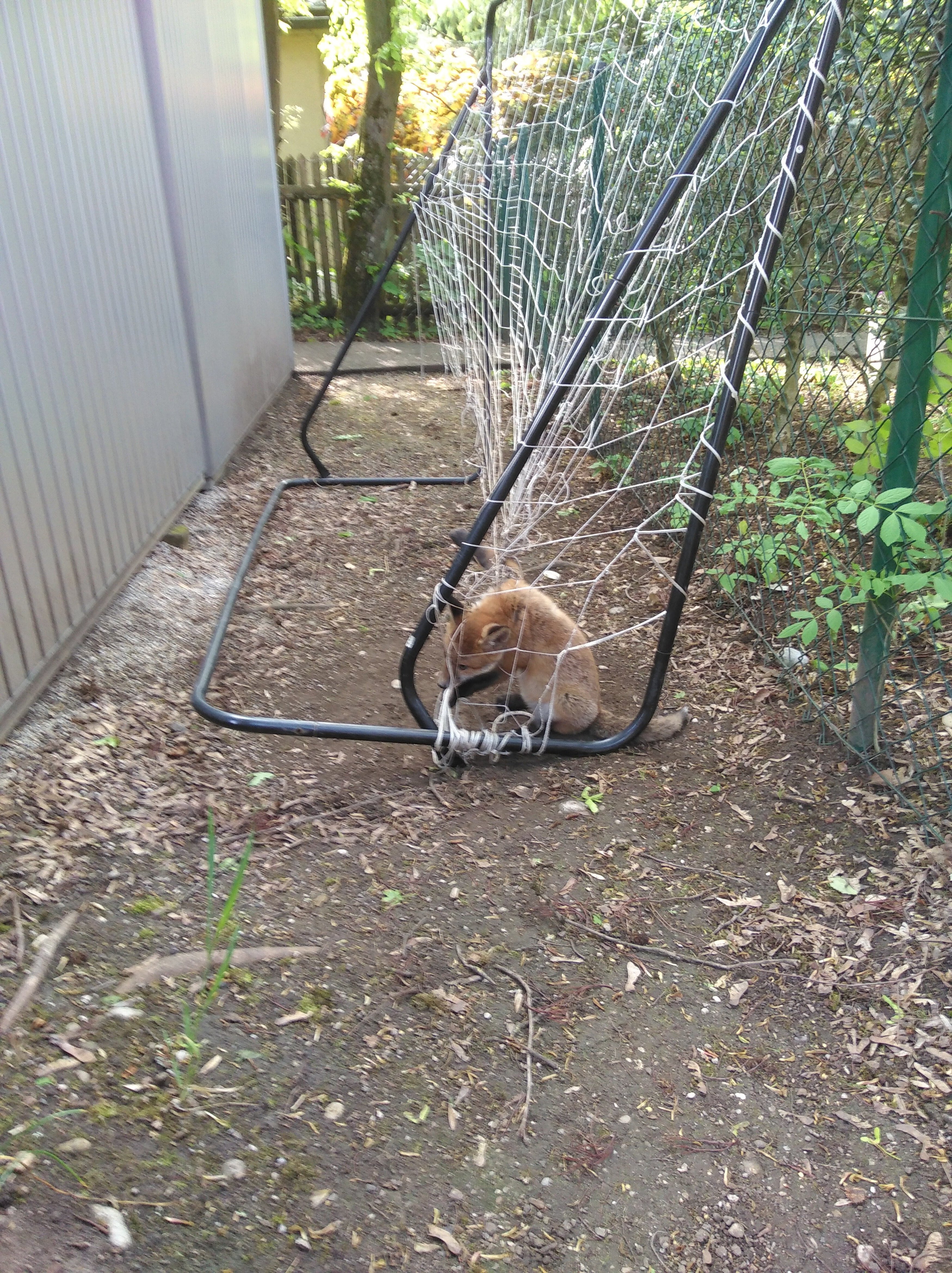 Anfang Mai ging ein Notruf bei den Tierärzten der Münchener Tierrettung ein. Die Anruferin aus Bogenhausen berichtete, dass sich auf dem Nachbargrundstück ein kleiner Fuchs in einem Fußballtor verfangen hat. Die Polizei hatte sie bereits verständigt. Wir klärten den Einsatz mit der Hausverwaltung des Grundstücks. Diese gab die Erlaubnis, das Grundstück zu betreten und schickte zur Unterstützung den Hausmeister.