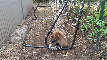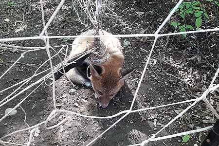 Der Hausmeister hielt dabei vorsorglich den Kescher. Das Jungtier wehrte sich jedoch kaum. Bei der anschließenden Untersuchung war deutlich, dass eine sofortige Entlassung in die Freiheit leider nicht möglich war. Das Jungtier war zwar kräftig und gesund, aber das Vorderbein hing schlaff herunter in der sogenannten Kusshandstellung. Eine Schädigung der Nerven durch die Abschnürung war möglich. Nach der tiermedizinischen Erstbehandlung wurde der Patient zur weiteren Versorgung in das Münchener Tierheim gebracht. Bei der Einlieferung zeigte sich schon eine deutliche Besserung. Der kleine Fuchs hielt die Pfote im Sitzen normal und trat leicht auf. Die Einschnürung hat zum Glück nicht zu einer dauerhaften Schädigung der Gliedmaße geführt.