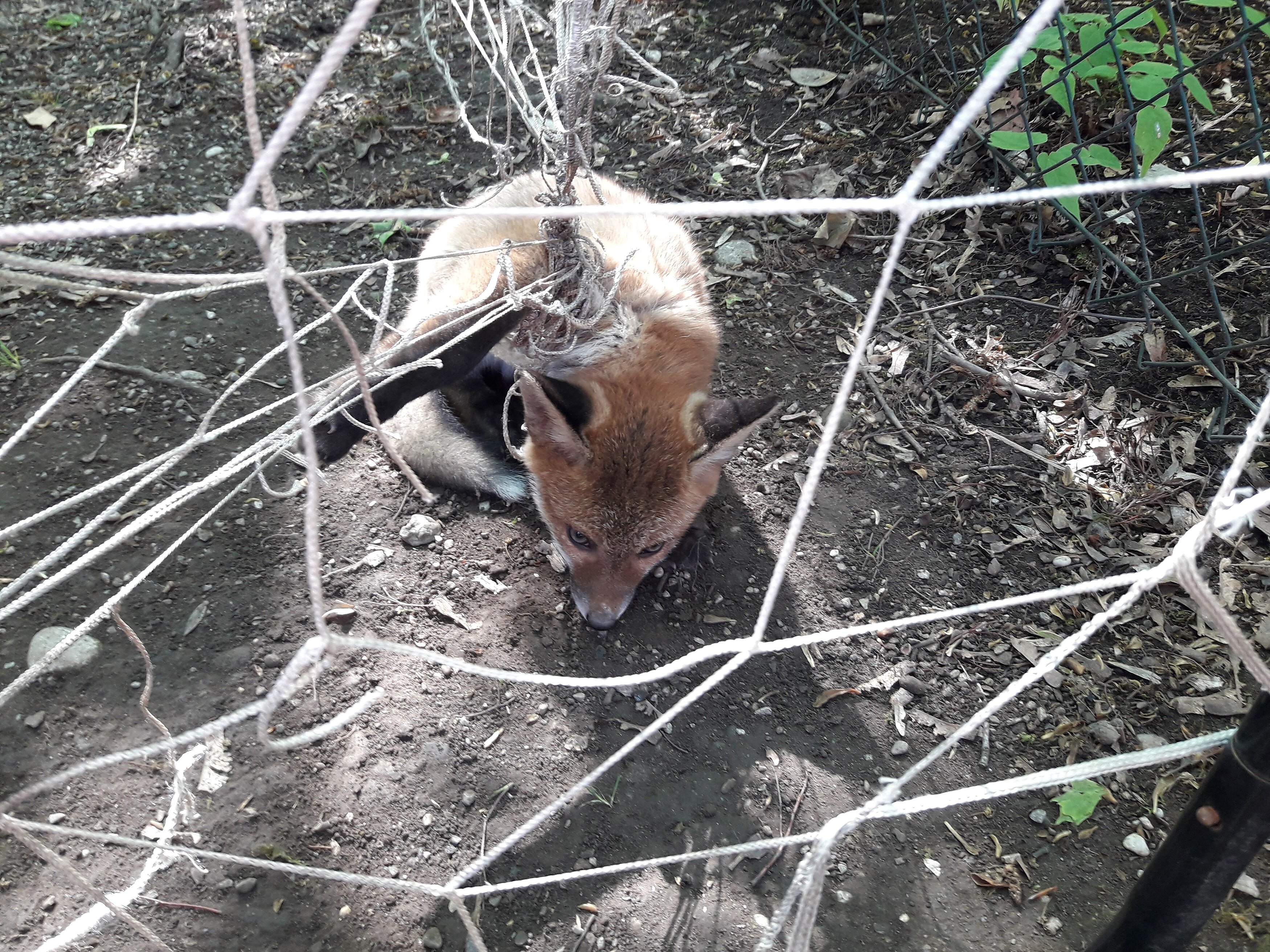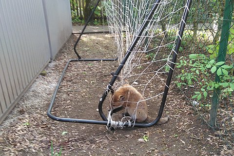Die Situation vor Ort war dramatisch. Der Fuchswelpe hing mit seinem stark eingeschnürten rechten Vorderbei im Fußballtornetz. Das Bein und der Brustkorb waren von den Schnüren so stark umwickelt, dass sich der Kleine nicht bewegen konnte. Wahrscheinlich war das arme Tier vor Stunden in das Netz hineingeraten, denn Nachbarn hörten bereits um fünf Uhr Tierschreie, die dann aufhörten. Durch verzweifelte Befreiungsversuche hatte sich der Arme dann immer fester eingeschnürt.