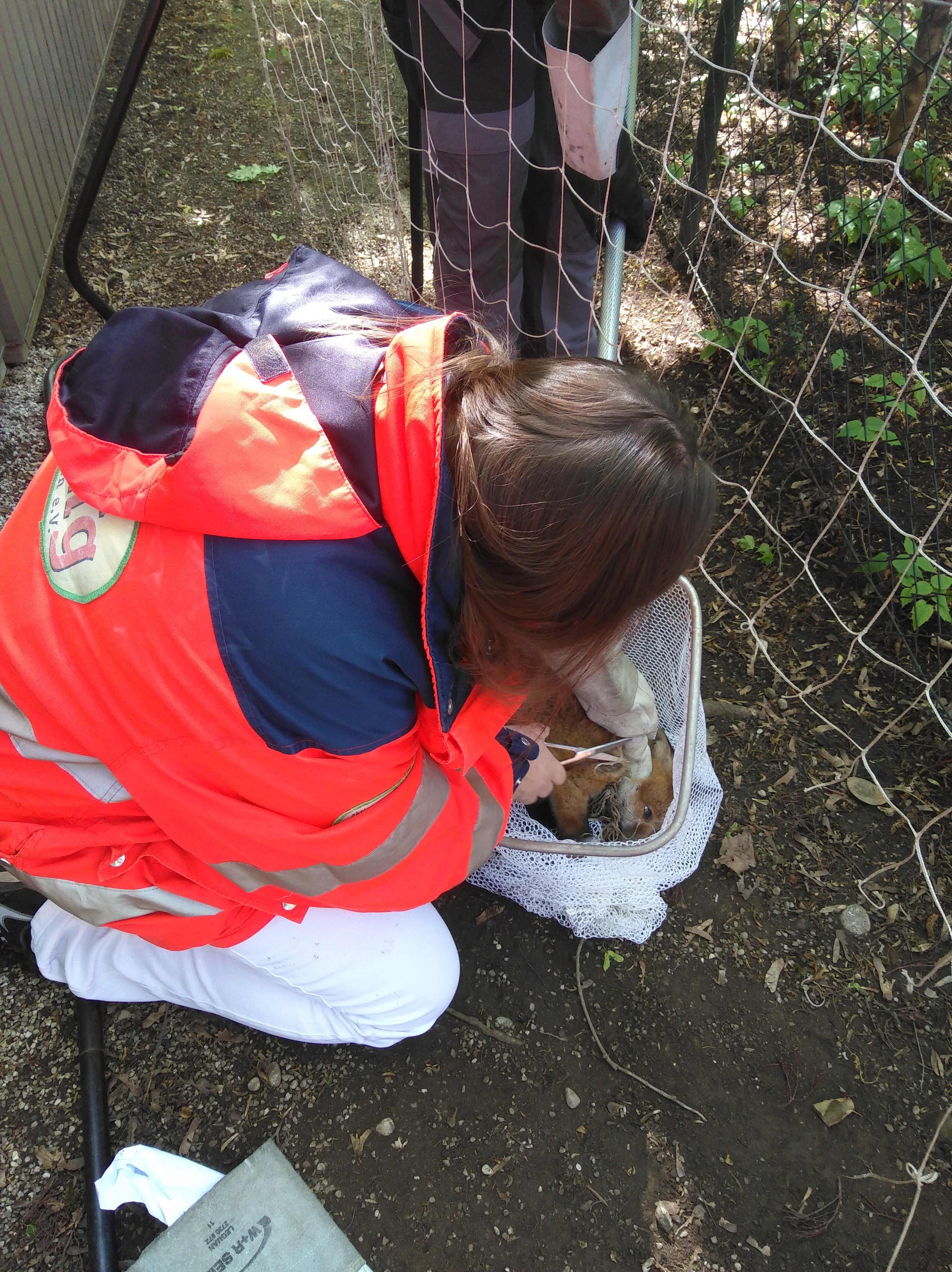 Wir befreiten den Fuchswelpen durch mühsames Herausschneiden aus dem Netz und Durchtrennen aller Schnüre, die das rechte Vorderbein im Schulter- und Ellenbogenbereich fest abschnürten.