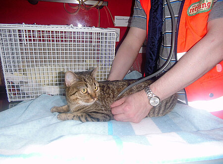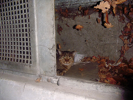 Das Kätzchen in Fürstenried-West hatte Glück im Unglück und kam ohne bleibende Schäden davon. Vor Ort angekommen, schilderte die Anruferin die Situation folgendermaßen. Durch die jämmerlichen Hilfeschreie einer Katze seien sie und einige Anwohner auf die Katze aufmerksam geworden. Die Besitzer hatten die Balkontüre gekippt und das Kätzchen versuchte, sich dadurch auf den Balkon zu zwängen. Als sie das Tier in der Türe feststeckend sahen, kletterte einer der Männer über die Balkonbrüstung und befreite das Kätzchen mit einem beherzten Griff aus dem Türspalt. Doch noch bevor die Retter weiteres Vorgehen besprechen konnten, schleppte sich das gelähmte Kätzchen unter den Balkon und versteckte sich dort. Der Balkon befand sich im Erdgeschoss, ca. 20 cm über dem Boden. Direkt darunter befand sich ein Fenster zum Keller. Vermutlich hatte sich die Katze dorthin in den Fensterschacht geflüchtet. Da sich niemand in den flachen Zwischenraum unter dem Balkon zwängen konnte, galt es nun, irgendwie in den Keller zu gelangen, das passende Fenster zu finden und dieses zu öffnen. Die Anruferin alarmierte den Hausmeisterdienst, da einige Betriebsräume im Keller nur über einen Zentralschlüssel zu öffnen waren. Nach kurzer Zeit kam der Hausmeister mit seinem Kollegen und zu zweit kamen sie uns tatkräftig zu Hilfe. Sie öffneten sämtliche Räume und organisierten eine Leiter und diverse Werkzeuge zum Öffnen der Fenster. Nach dem Ausschlussverfahren standen wir nun vor einem geschlossenen Kellerabteil, hinter dessen Fenster sich die Katze vermutlich befinden musste. Weitere Zeit verging bis die Besitzerin des Abteils gefunden war. Ohne zögern öffnete sie uns das Abteil und tatsächlich saß das Kätzchen völlig verängstigt im schmutzigen Schacht des Fensters. Nachdem das verrostete Fenstergitter aufgehebelt war, konnten wir die „Kleine“ endlich befreien. Es blieben keine bleibenden Schäden. Im Einsatzwagen untersuchten wir anschließend das Kätzchen. Es war noch im leichten Schockzustand und zeigte eine geringe Lähmung des rechten Hinterbeines. Die von der Anruferin beschriebene vollständige Lähmung der Hinterläufe bestätigte sich Gott sei Dank nicht. Vermutlich waren die Blutgefäße nicht lange genug gequetscht, so dass die Durchblutung der Hinterbeine wieder stattfinden konnte.