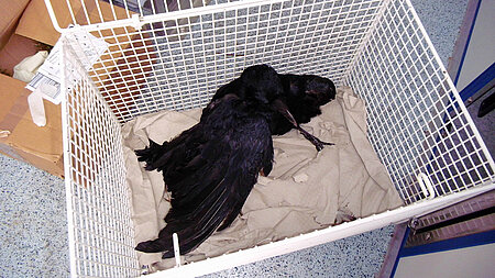Von Daniel Prengel. Augenscheinlich handelte sich um ein junges Tier, das seine ersten Flugversuche am Boden unternommen hatte. Trotz kalendarischem Frühling war es bitterkalt an dem Morgen, als der Finder mich anrief. Er schilderte die Situation so, dass sich eine Krähe im Zaun verfangen habe. Zunächst dachte ich, die Situation sei leicht zu lösen, indem der Anrufer die Krähe einfach vorsichtig aus dem Zaun befreie. Er versicherte mir aber, dass sie so im Zaun fest hänge, dass ein Befreiungsversuch durch ihn nicht möglich wäre. Vor Ort angekommen, konnte ich diese Aussage nur bestätigen. Mit beiden Flügeln hatte das Tier sich durch die Maschen des Zauns geschlängelt und hing auf Höhe der Schultergelenke so fest, dass es sich aus dieser Lage aus eigener Kraft nie befreien hätte können. Ich versuchte nun, die Flügel vorsichtig heraus zu ziehen, aber die Krähe war so wehrhaft, dass ich Sorge um die körperliche Unversehrtheit des Tieres hatte. Ich entschloss mich zu einer Sedierung. Nach kurzer Zeit konnte ich mit einigem Geschick die Flügel aus dem Zaun befreien. Im Käfig sitzend wurde die Krähe auch schon langsam wieder wach. Gott sei Dank stellte ich anschließend nur leichte Abschürfungen fest, und so konnte ich das Tier nach der Verabreichung eines entzündungshemmenden Schmerzmittels in die Vogelklinik transportieren.