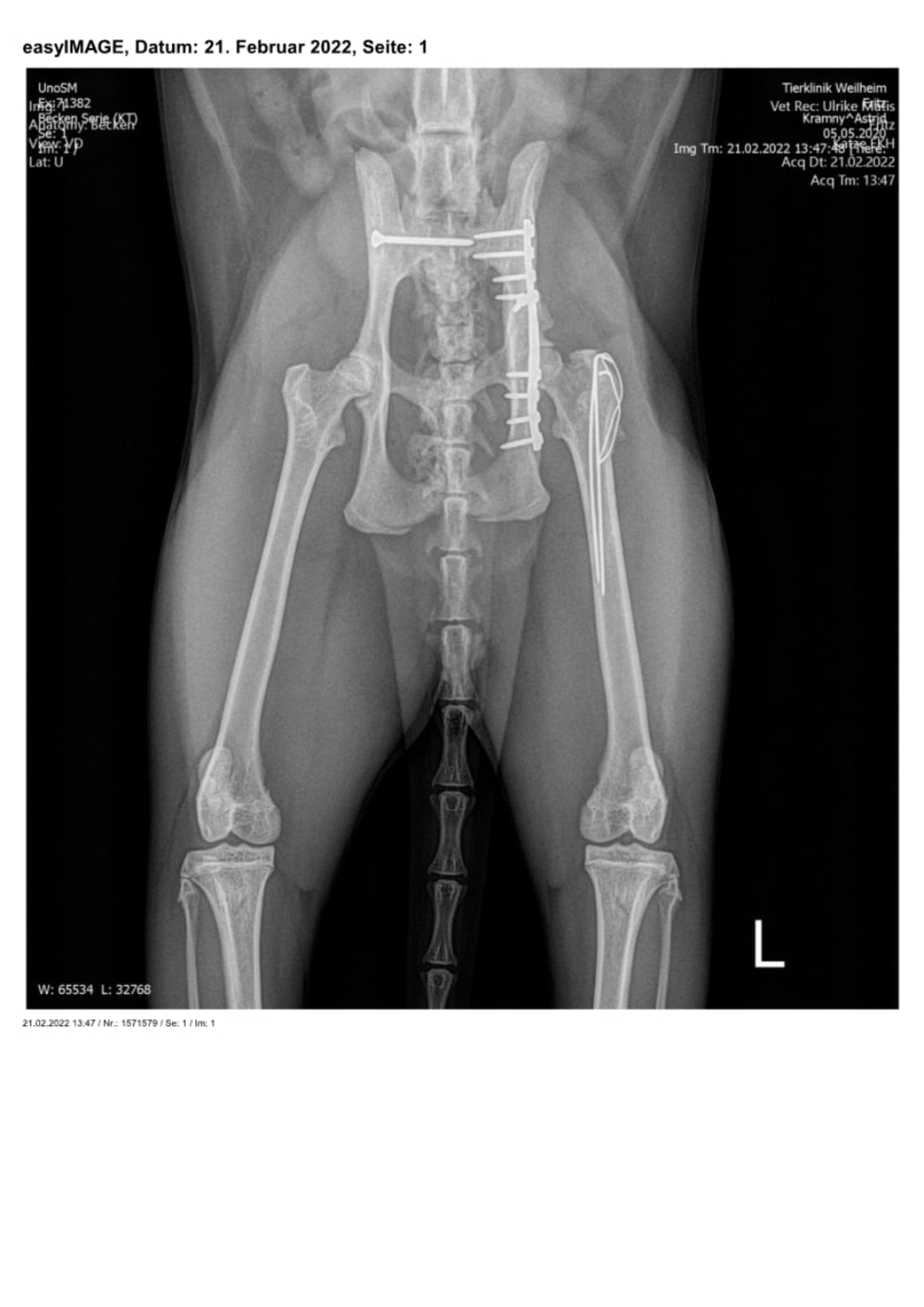 Zuerst wurden das ausgerenkte rechte Kreuz-Darmbein-Gelenk sowie der in seiner unmittelbaren Nachbarschaft verlaufende Ischias dargestellt und das Darmbein nach seiner Reposition mit einer 2,0 mm dicken und 24 mm langen Schraube an den Kreuzbeinkörper fixiert. Nach dem Wundverschluss wurde der Kater auf die andere Körperseite gelagert und sodann der direkt vor der Hüftgelenkspfanne Eine weitere Schraube diente der Adaptation eines Darmbeinsplitters an die Hauptfragmente. Da die Freilegung dieser Beckenregion meistens auch einen Knochenschnitt am Oberschenkel zum Verlagern der Kruppenmuskeln erfordert, wurden die Endsehnen dieser Muskeln mit dem knöchernen Segment abschließend durch 2 Bohrdrähte und einer 8-förmigen Drahtschlinge wiederbefestigt.
