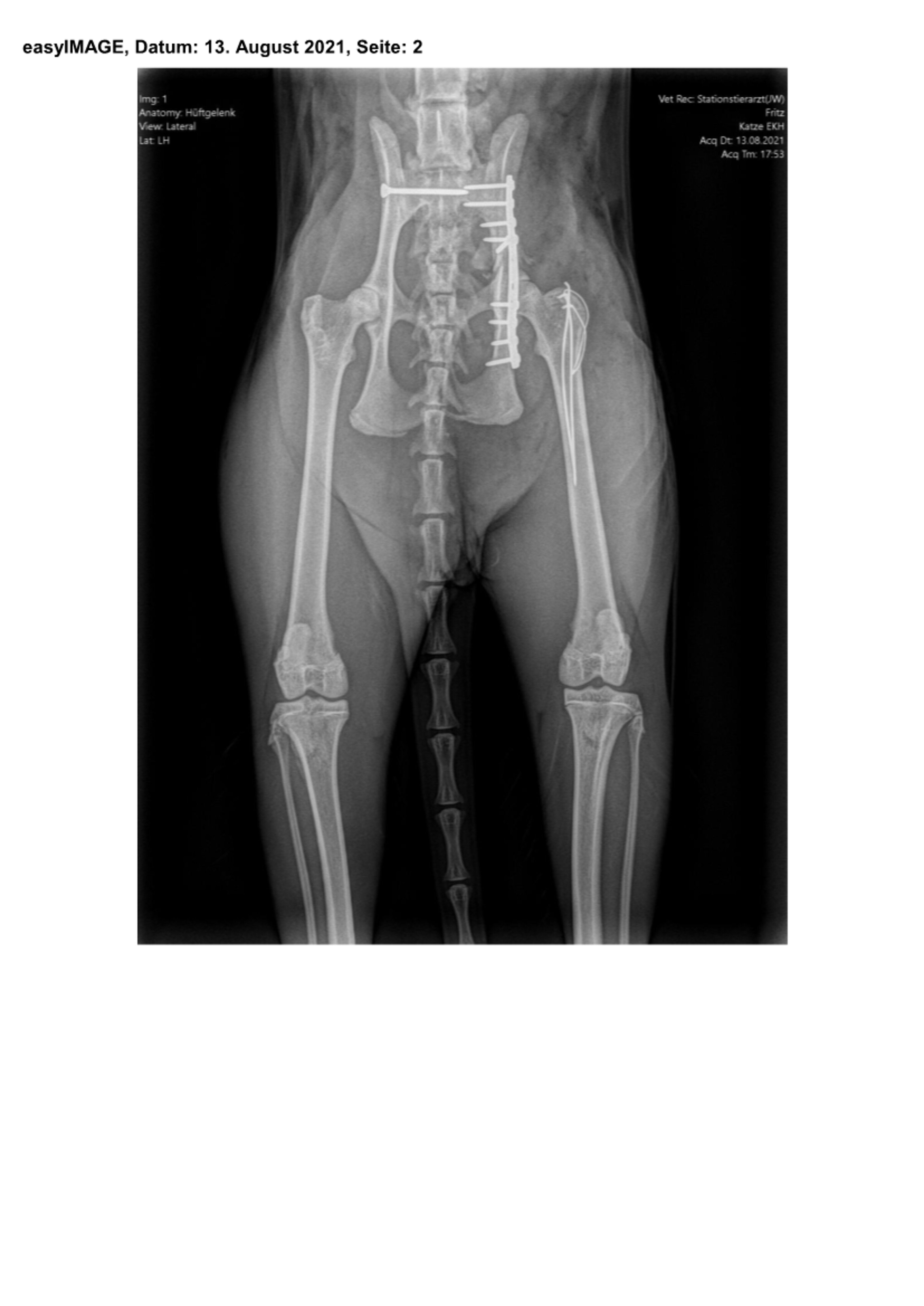 Bei der Nachuntersuchung des Patienten sechs Monate später präsentierte sich der Kater völlig beschwerdefrei und war sowohl in der Beckenregion als auch an den Gliedmaßen kräftig bemuskelt. Die Knochenbrüche waren sehr gut geheilt, ohne Einengung der Beckenhöhle und ohne die Ausbildung einer Hüftgelenksarthrose. Von einer Entfernung der Implantate wurde abgesehen, da alle Metallteile reizlos und ohne Lageveränderung integriert waren.