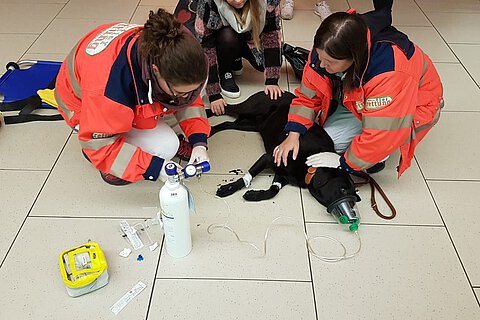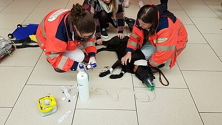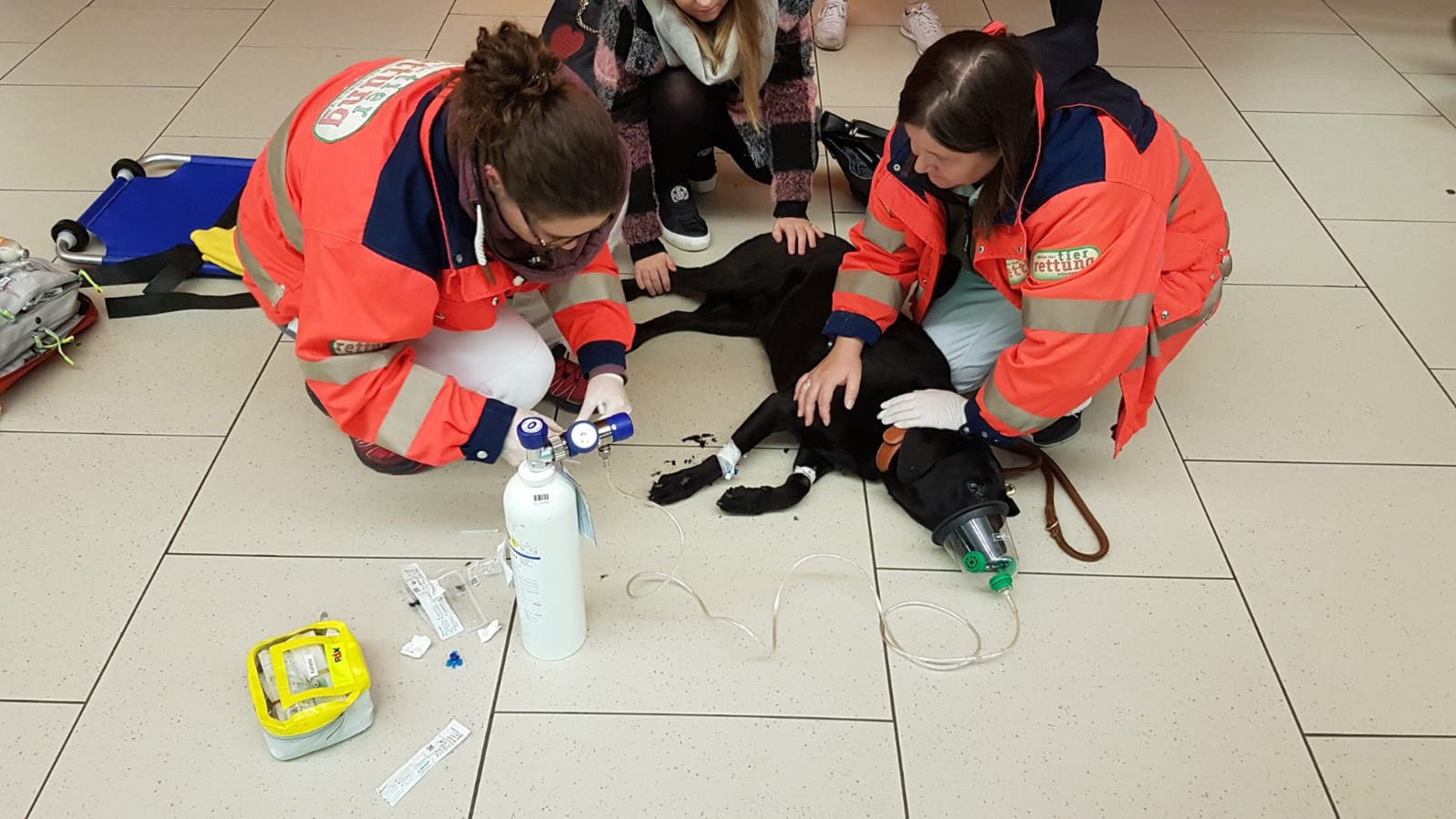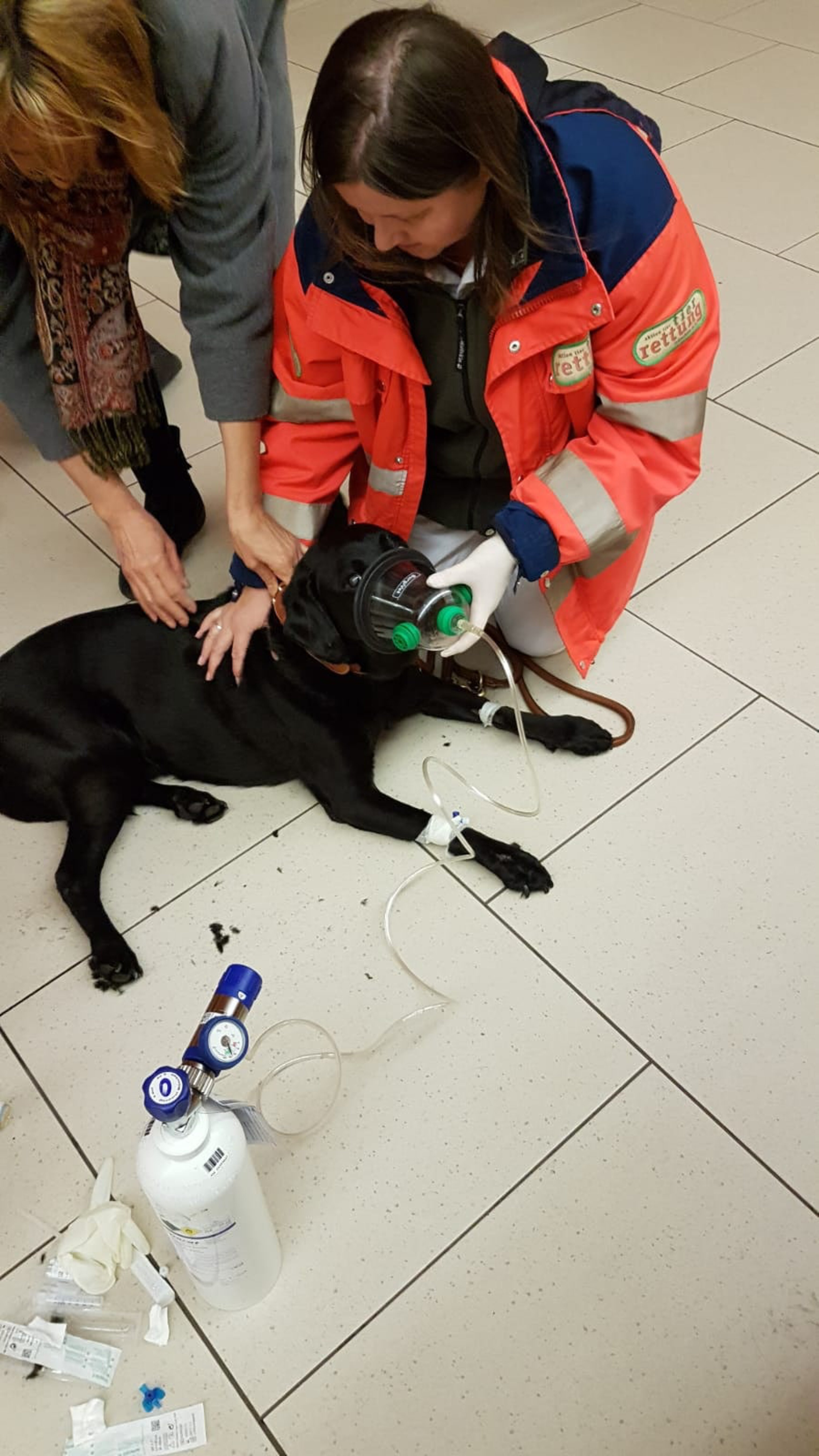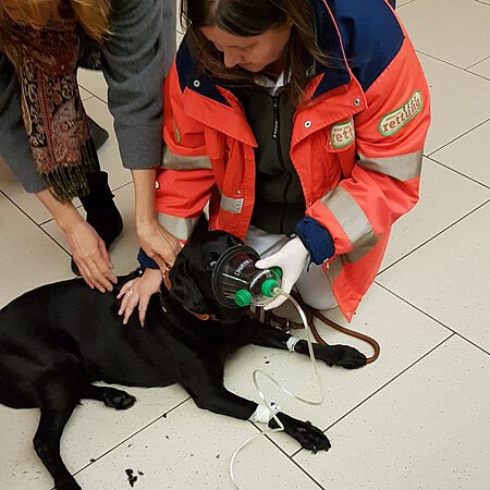 Und so begann es – Holly war mitten auf dem Bahnsteig plötzlich zusammen gebrochen, nachdem sie aufgrund ihrer Arthrose Probleme hatte, auf den glatten Fliesen zu laufen. Sie hat plötzlich abgefangen zu zittern und fing dann an, für knapp acht Minuten zu krampfen. Es folgten eine kurze Pause und ein erneuter Anfall von etwa fünf Minuten. Wir waren während unserer Fahrt zum Marienplatz immer wieder telefonisch mit dem Passanten in Verbindung, der uns über die Sachlage auf dem Laufenden hielt. Die Patienten-Besitzerin war völlig aufgelöst und erschrocken über dieses plötzliche Geschehen. Sie beruhigte sich aber schnell, nachdem wir da waren. Holly selbst war bei unserer Ankunft aus dem Krampf raus, aber sehr schlapp und zunächst kaum ansprechbar. Wir legten einen Venenzugang und fuhren Holly mit Infusion und Sauerstoff in die medizinische Kleintierklinik.