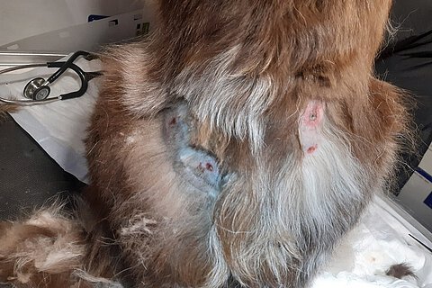 Vor Ort fanden wir tatsächlich vier große Einbisslöcher quer über den kompletten Rücken der Hündin, verursacht durch die je zwei Fangzähne des Ober- und Unterkiefers des anderen Hundes. Da leider die Bisse erst heute gefunden wurden, waren sie schon hochgradig entzündet und mit Eiter gefüllt. Nach vorsichtigem Ausscheren der Bisswunden konnten diese jedoch mit Wundspüllösung gereinigt und mit Wundsalbe abgedeckt werden. Dazu noch Schmerzmittel und Antibiose – endlich geschafft.