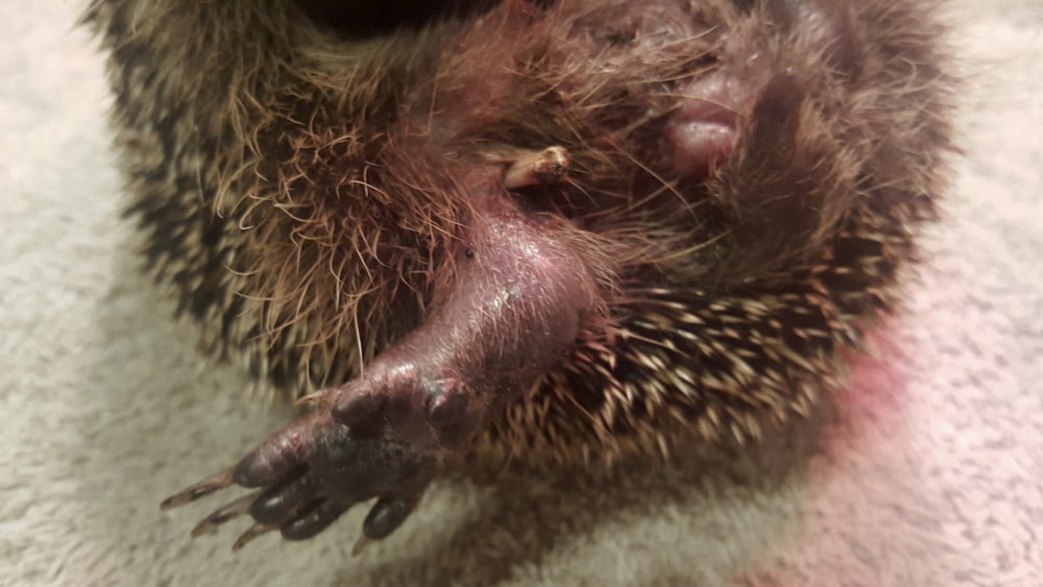Der Igel, der bei der Tierrettung abgegeben wurde, hatte eine offene Fraktur am rechten Hinterbein erlitten. Da er sich sehr stark einrollte, war seine Verletzung nicht genau zu sehen. Die Tierärztin musste ihn in Kurznarkose legen, um ihn untersuchen zu können. Dabei zeigte sich das Ausmaß der Verletzung.