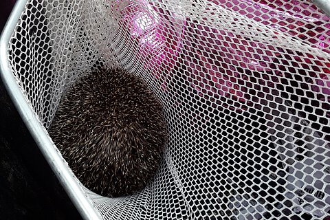 Wir bekamen einen Anruf von einem besorgten Mann, dessen Frau beim Müllrausbringen einen lebendigen Igel in der großen Mülltonne entdeckt hatte. Der Ehemann war schon bei der Arbeit, und seine schwangere Frau kam nicht an das Tier dran. Sie hatte auch keine andere Möglichkeit der Unterstützung: Der Hausmeister war leider nicht erreichbar und die Nachbarn schon außer Haus.