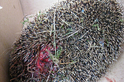 In der Zwischenzeit hatte mir der Tierarzt eine neue Adresse durchgegeben, ich verstaute die Stacheligen nach der Behandlung in ihren Kartons und fuhr in ein Randgebiet der Stadt, diesmal im Westen. Ein Mann hatte bei der Gartenarbeit einen Igel verletzt. Mit der Motorsense wollte er das Gestrüpp unter seiner Hecke kürzen und sah plötzlich einen rötlichen zuckenden Fleck. Er hatte dem Igel mit der Sense ein großes Stück stachelige Haut auf dem Rücken abgefetzt. Ansonsten war das Tier vom Allgemeinbefinden her ungestört. Wahrscheinlich wäre die Wunde auch nach einigen Wochen ohne ärztliches Zutun narbig und unter starken Schmerzen verheilt, aber bei den herrschenden Außentemperaturen hätten sich in Kürze die Fliegen auf ihn gestürzt und Eier in das blutige Gewebe gelegt. Die schlüpfenden Maden würden den Igel regelrecht von innen auffressen. Der diensthabende Tierarzt der Tierrettung bat mich nach der Untersuchung, ihn in die chirurgische Tierklinik zu bringen. Nachdem ich ihn dort abgeliefert hatte, brachte ich die beiden anderen Stachelhäuter und eine nebenbei eingesammelte mutterlose Jungtaube ins Tierheim. Die Igel hatten sich erstaunlicherweise tatsächlich schon etwas erholt, wuselten in ihren Schachteln herum und versuchten auszubüchsen.
