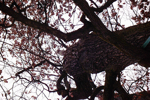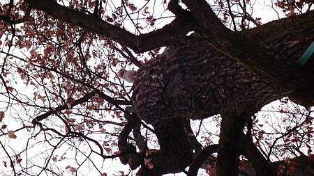 Hier in diesem Park jedoch sind die Umgebungsvoraussetzungen für die Jungvögel nicht so optimal. Hier fehlt das Unterholz. Am Baumstamm in der direkten Umgebung des Nestes fehlt das Gebüsch. Hier finden die abgestürzten Ästlinge keinen Unterschlupf und können sich nicht verstecken. Zudem waren die Witterungsverhältnisse zu diesem Zeitpunkt extrem schlecht. Es schneite und es war eisig kalt. Auch hatten die Bäume noch kein Laub, so dass diese den Jungkäuzen auf den Ästen und am Nest keinerlei Versteck bzw. Sichtschutz bieten konnten. Beim Besichtigen der Brutstätte entdeckten wir einen weiteren Jungkauz (Ästling) oben an der Baumhöhle. Dieser wurde mehrmals von Rabenkrähen attackiert und flog dann ebenfalls runter. Dieser Jungvogel war noch schwächer, als der zuvor untersuchte, er zeigte kaum Gegenwehr. Wegen der schlechten Witterungsund Umgebungsbedingungen und Angesichts dessen, dass die Jungkäuze so geschwächt und in einem schlechten Allgemeinzustand waren, nahm ich beide mit und brachte sie in die Vogelklinik nach Oberschleißheim.