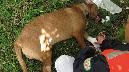 Von Judith Brettmeister. Um sich dem ausgesetzten Vierbeiner überhaupt nähern zu können, musste er zunächst beruhigt werden. Beherzt schritten ein Polizeibeamter und Gabor Horvath mit zwei Fangstangen ausgerüstet auf den Hund zu, der sich jeder Annäherung widersetzte. Als die beiden die Fangschlaufen um den Hals des Vierbeiners gelegt hatten und ihn so fixieren konnten, gelang es Daniel Prengel eine Narkose in einen Muskel zu injizieren. Der Hund konnte so in eine Hundebox gelegt werden. Wohl aufgrund der Aufregung und der Angst des Tieres schien der Kreislauf des Vierbeiners zu kollabieren, was sich durch blasse Schleimhäute und flache Atmung andeutete. Sofort legte Dr. Horvath dem Hund einen venösen Zugang, um den Kreislauf des Hundes mit einer Infusion zu stabilisieren.