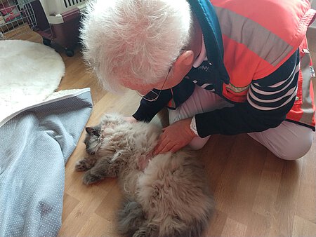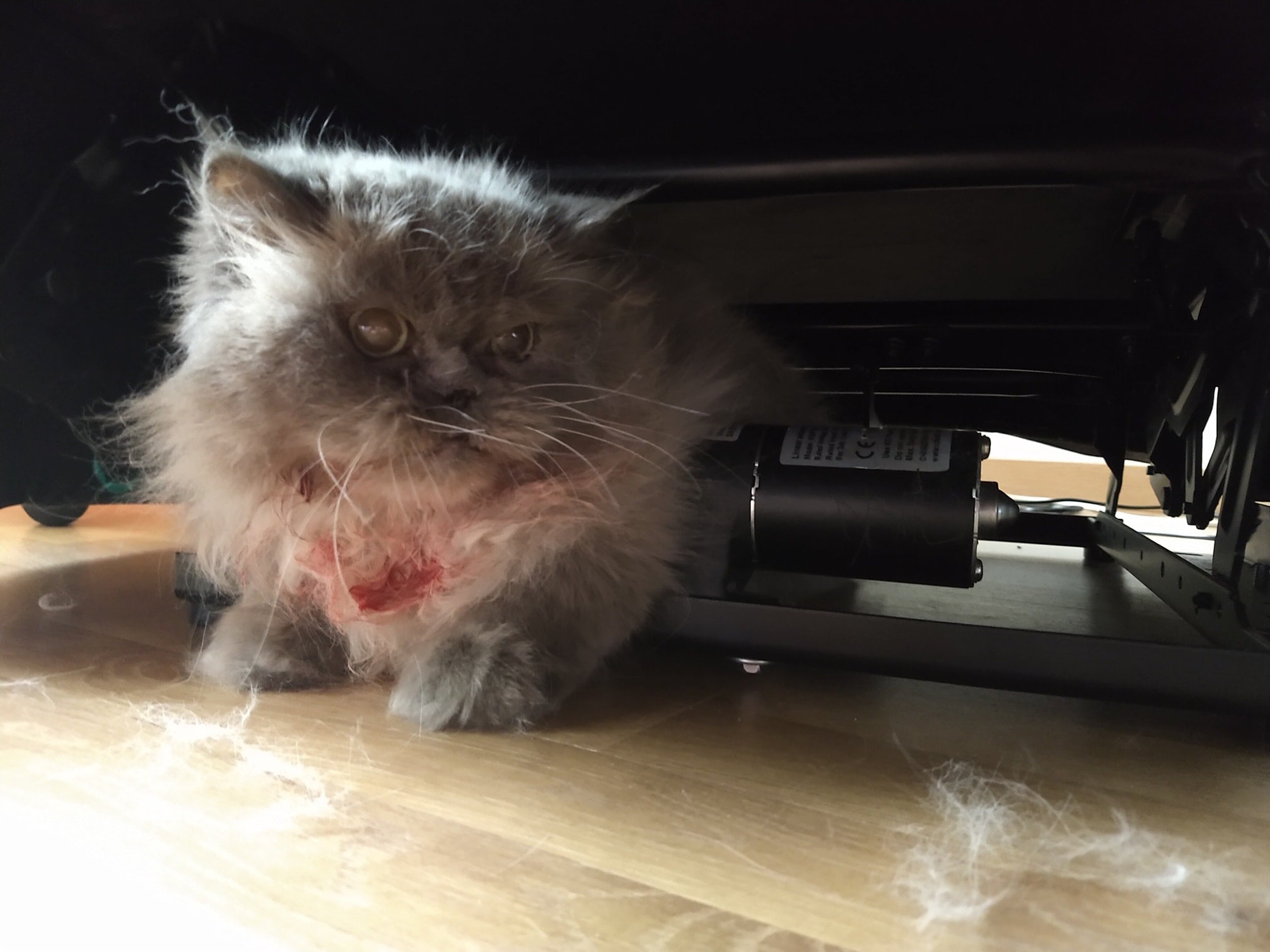 Die Befreiung war Millimeterarbeit, gelang aber glücklicherweise gut. Der Perserkater hatte wirklich Glück im Unglück, denn weder Rippen noch innere Organe waren betroffen. Er kam mit einer großflächigen Quetschung der Haut, einem Bluterguss und einem Stück eingebüßtem Fell davon. Bei der eingehenden Nachuntersuchung zeigte sich außerdem, dass der Kater sich bei seinen verzweifelten Befreiungsversuchen einen Eckzahn am Metallgestänge ausgebissen hatte – daher das Blut am Hals.