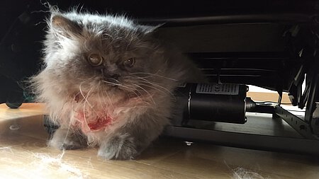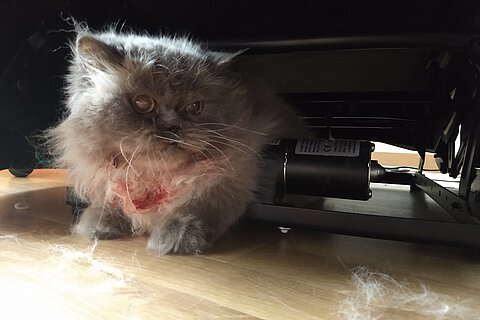 Die Tierrettung München erhielt einen Notruf der aufgelösten Tierbesitzerin: „Bitte kommen Sie schnell, mein Kater ist unter dem Sofa eingeklemmt, er muss sich dort im Motor verfangen haben! Er blutet schon und hat wahnsinnige Angst!“. Im Hintergrund war das panische Miauen des Tieres zu hören. Die Tierärzte machten sich sofort auf den Weg.