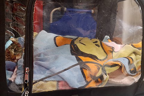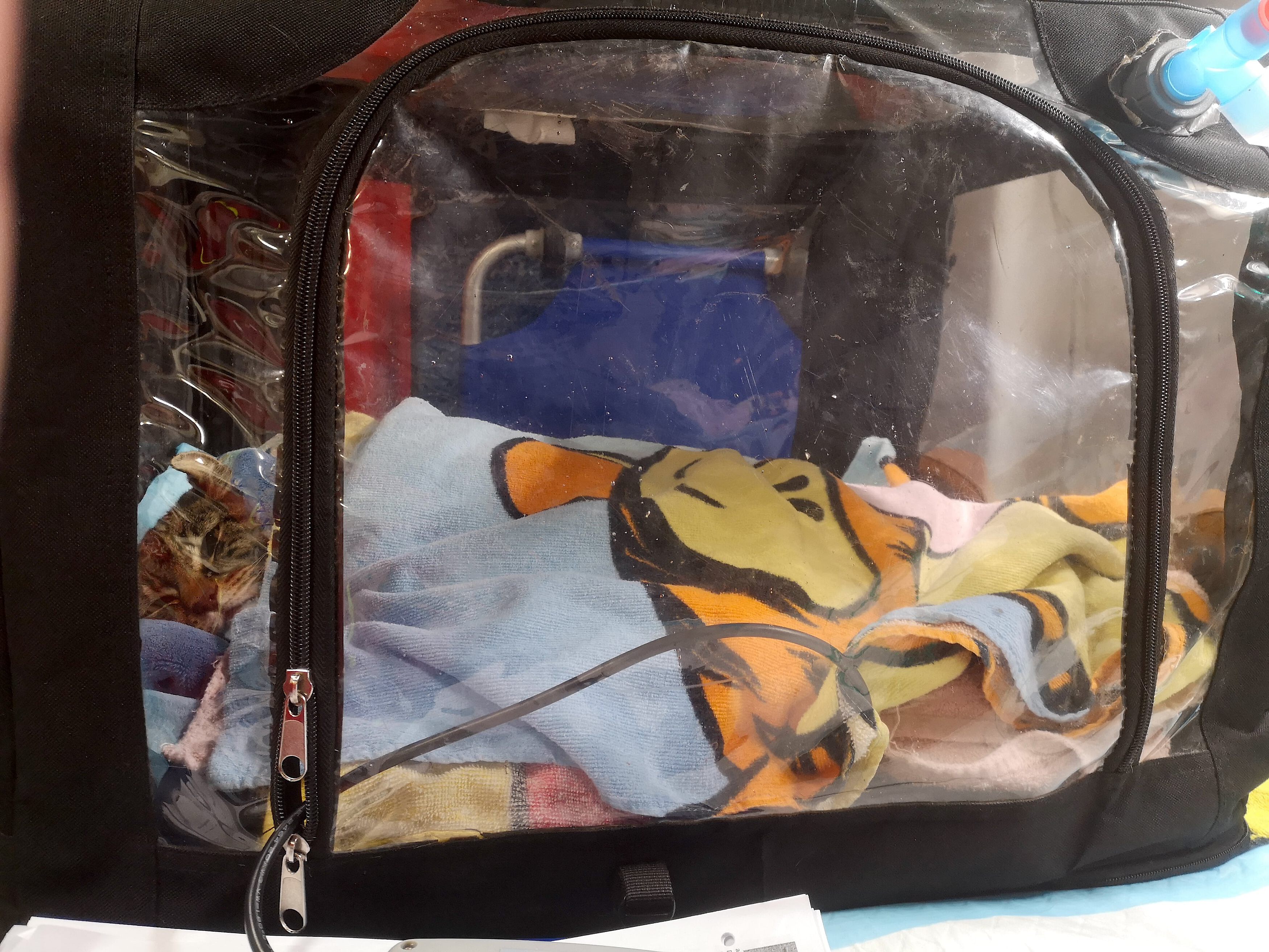 Auf dem Transport wurde „Brooklyn“ von uns gewärmt und bekam zur Stabilisierung des Kreislaufes Sauerstoff. Auf eine Infusion wurde aufgrund der massiv erniedrigten Körpertemperatur verzichtet, da diese sich auch negativ auf die Lunge auswirken kann.