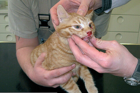 Als die Tierärztin eingetroffen war, stellte sie sofort eine Kieferfraktur fest. Da die Katze sich kaum bewegte, musste auch angenommen werden, dass schwere innere Verletzungen vorlagen. Noch vor Ort leitete Frau Dr. Sylvia Haghayegh eine Schmerz- und Schockbehandlung ein. Während der Fahrt wurde das Kätzchen mittels Wärmepads gewärmt. In der Chirurgischen Tierklinik angekommen, wurde die Katze geröntgt, um innere Verletzungen auszuschließen. Es wurde eine Lungenprellung festgestellt. Der Tierfreund, der die verletzte Katze entdeckt hatte, war in der Zwischenzeit nicht untätig gewesen. Er hatte in der unmittelbaren Umgebung Zettel aufgehängt, dass eine kleine Katze gefunden worden war und der Besitzer sich bitte bei der Tierrettung melden möge. Solche engagierten Menschen sind für die Tierärzte wahre Glücksfälle, denn bei Einsätzen, bei denen ein Tier unter Abwesenheit des Besitzers schwer verunglückt ist und die weder tätowiert noch gechipt sind, können sich die Tiermediziner nicht auch noch zusätzlich um die Ermittlung etwaiger Tierhalter kümmern. Hier hat die Erstversorgung des Tieres oberste Priorität. Bereits am Abend meldete sich die Katzenhalterin. Das sechs Monate alte Kätzchen musste sich irgendwie durch den vernetzen Balkon im fünften Stock gezwängt haben und stürzte dann in die Tiefe auf die abgestellten Fahrräder. Erst nach Ausheilung und Stabilisierung des Lungentraumas konnte der Kieferbruch operativ versorgt werden. Alsbald konnte das kleine Kätzchen wieder zu Hause sein.