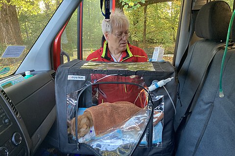 In der Notfallbehandlung wurden sofort lebensrettende Maßnahmen eingeleitet: Das Tier erhielt ein stark wirkendes Schmerzmittel, wurde auf eine wärmende Unterlage gelegt, um langsam wieder aufzuwärmen. Mit Hilfe des Finders wurde ein venöser Zugang gelegt, was beim zweiten Versuch gelang, da der Blutdruck äußerst niedrig und die Vene kaum sichtbar war. Anschließend wurde die Katze an eine Infusion angeschlossen, Sauerstoff wurde verabreicht. Ein Chip wurde abgelesen, doch das Ergebnis war negativ, ebenso waren keine Tätowierungen vorhanden. Der Finder wurde gebeten, Aushänge zu machen, um die Besitzer ausfindig zu machen. Zum Transport wurde die Katze in einen Sauerstoffkäfig gelegt und in der Kleintierklinik als Notfallpatient telefonisch angekündigt. Während des Transports wurde sie weiterhin mit Sauerstoff versorgt, vorsichtig an eine Dauertropfinfusion angeschlossen und mit Wärme stabilisiert.