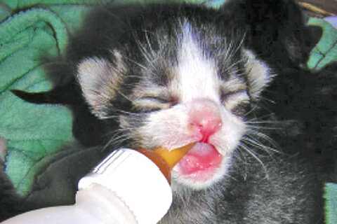 Die Kätzin wurde nach der Geburt zusehends schwächer und zeigte kaum noch Appetit. Als dann am Wochenende das arme Tier auch noch fiebrig wurde, entschloss sich die Besitzerin, den Nottierarzt der „Tierrettung München“ anzurufen, weil sonst kein Veterinär in der Nähe erreichbar war. Schon kurz darauf stand der feuerrote Einsatzwagen der ersten tierärztlichen Notfallambulanz in Deutschland vor der Tür. Die Kätzin hatte über 40°C Fieber und zeigte eine hochgradige Entzündung der Gesäugeleiste. Aber was tun? Schließlich kann man doch die Jungen nicht verhungern lassen, gerade auch, weil in der Muttermilch so viele Nähr- und Abwehrstoffe enthalten sind. Um die Katzenmutti zumindest ein bisschen zu entlasten, wurde die Beschaffung von „Katzenmilch“ empfohlen, damit die Jungen nicht den ganzen Tag am Gesäuge zubringen, aber trotzdem durchgebracht werden können. Die Kätzin wurde sogleich antibiotisch behandelt und bekam außerdem ein fiebersenkendes Mittel.